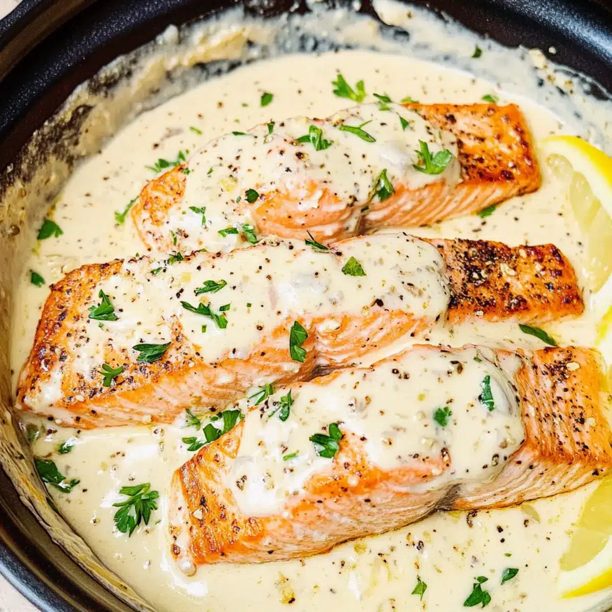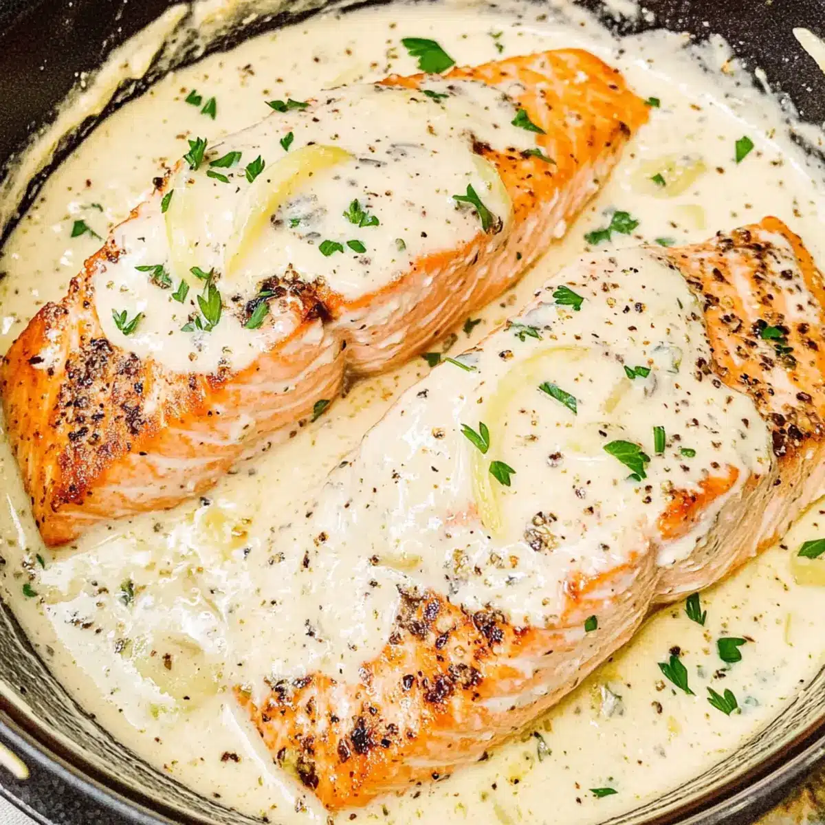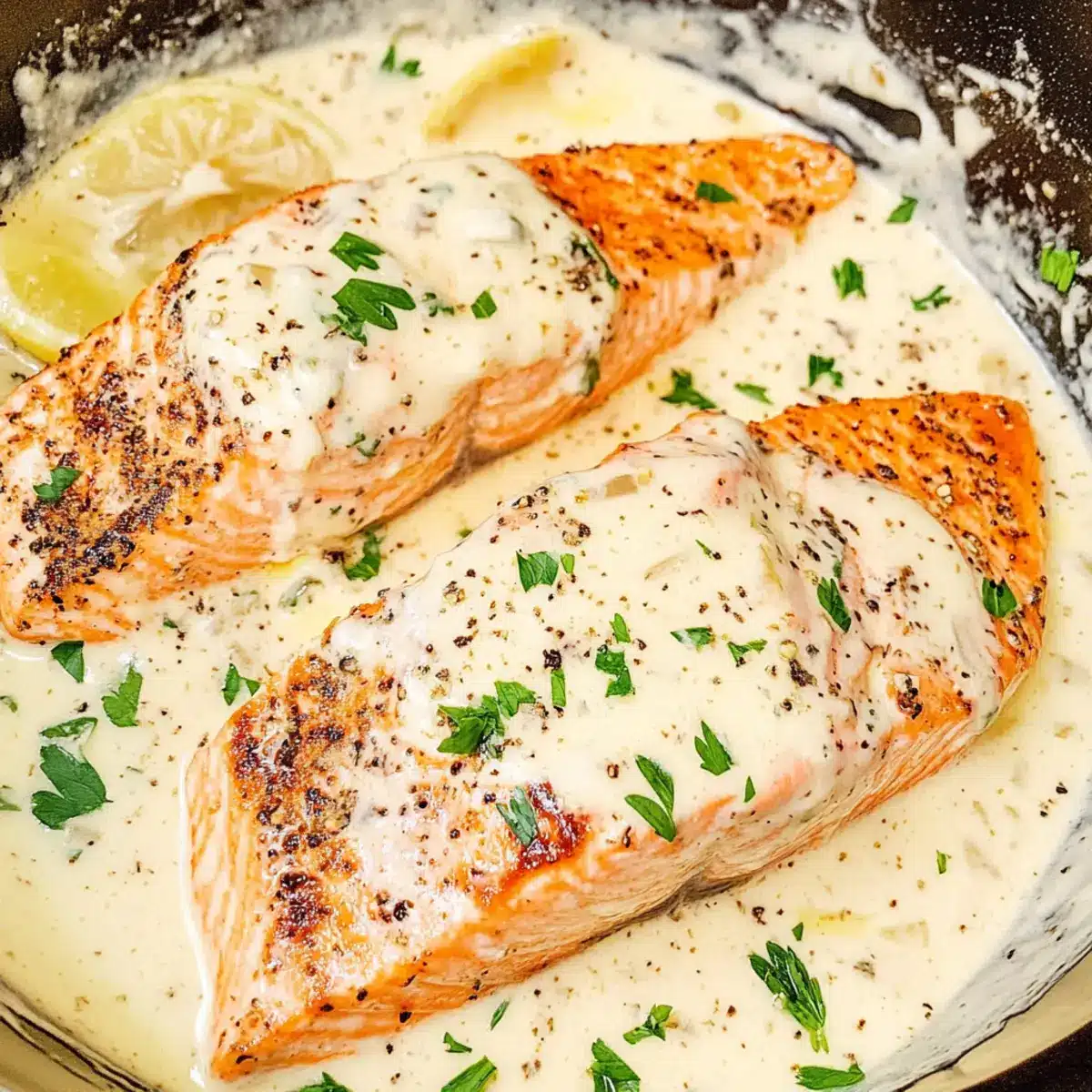 - Transfer cooked salmon to plates, drizzle with the creamy sauce, and garnish with parsley before serving.