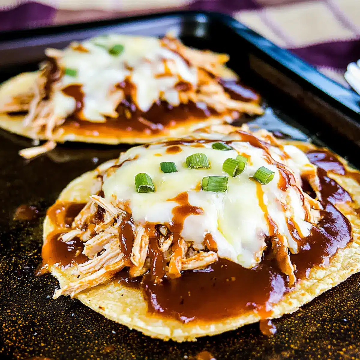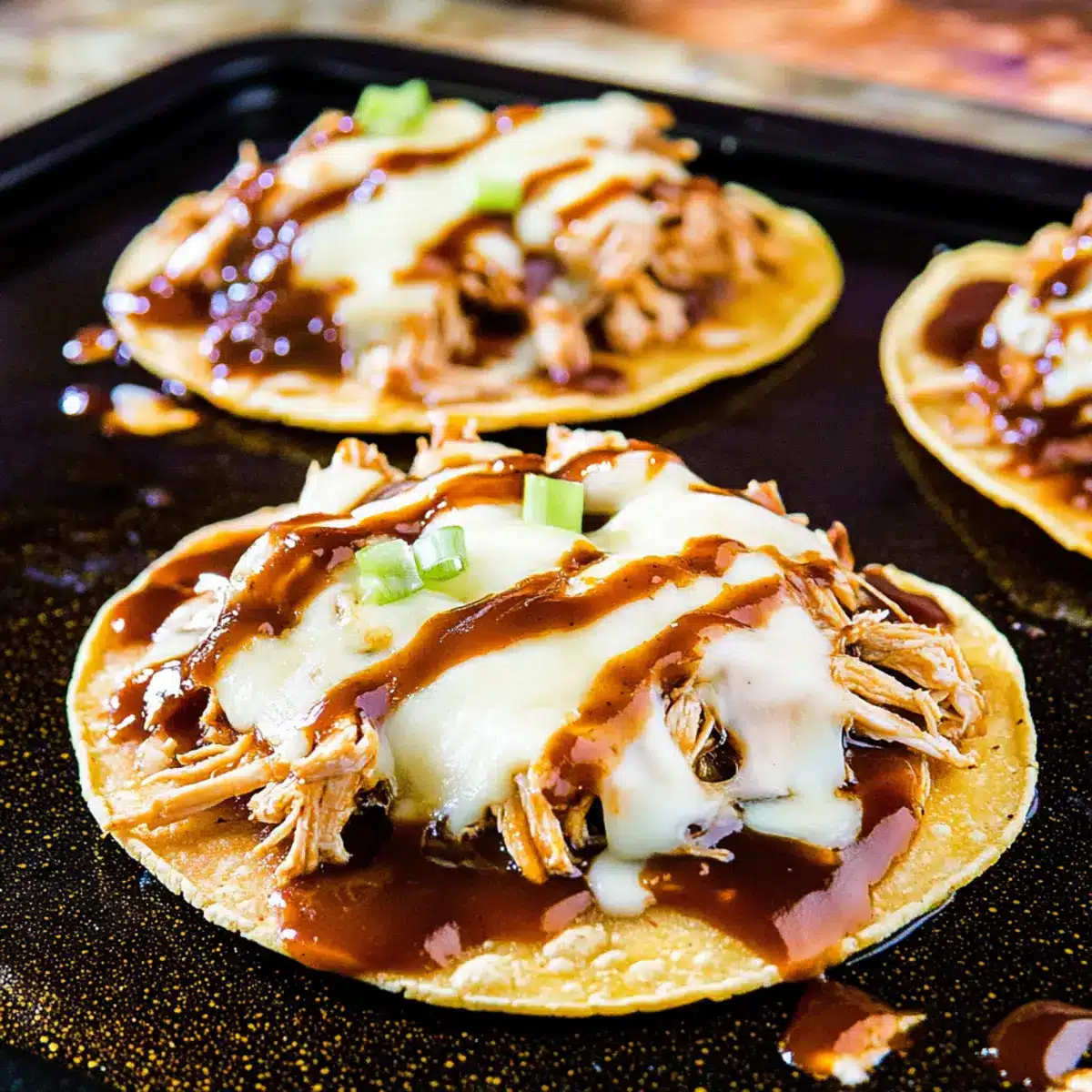 Remove the tostadas from the oven, and drizzle the remaining barbecue sauce over the melted cheese and chicken. This final touch enhances the flavor and adds a lovely sheen. For an extra crunch and pop of color, garnish with sliced green onions or your preferred fresh herbs before serving.