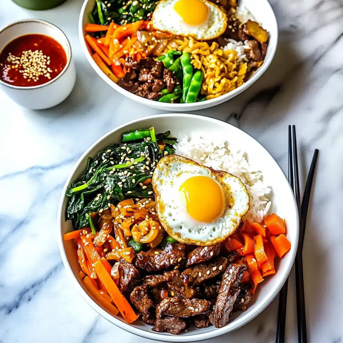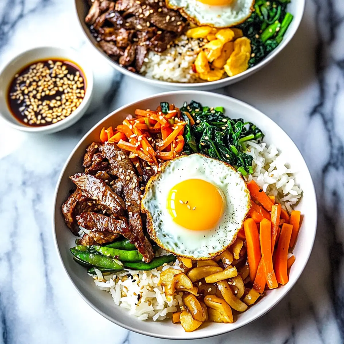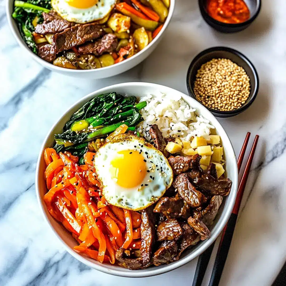 To serve, scoop a generous portion of rice into bowls. Artfully arrange the sautéed vegetables and beef around the rice. Add a dollop of kimchi (if using) and place the perfectly fried egg on top. For the finishing touch, sprinkle sesame seeds over the bowl for added crunch and flavor.