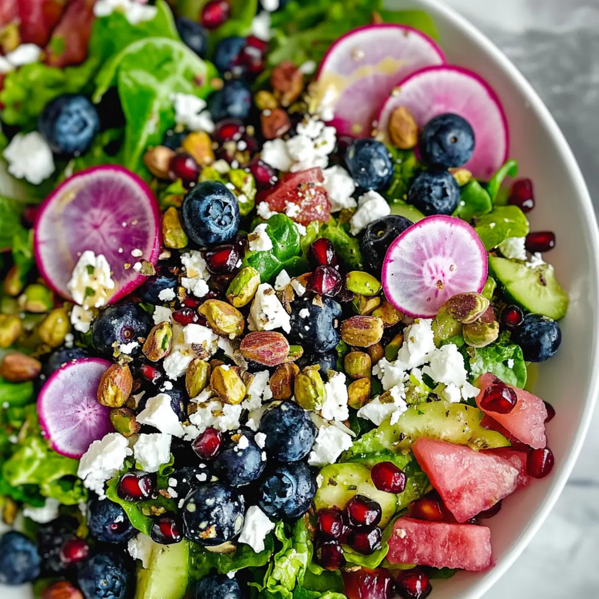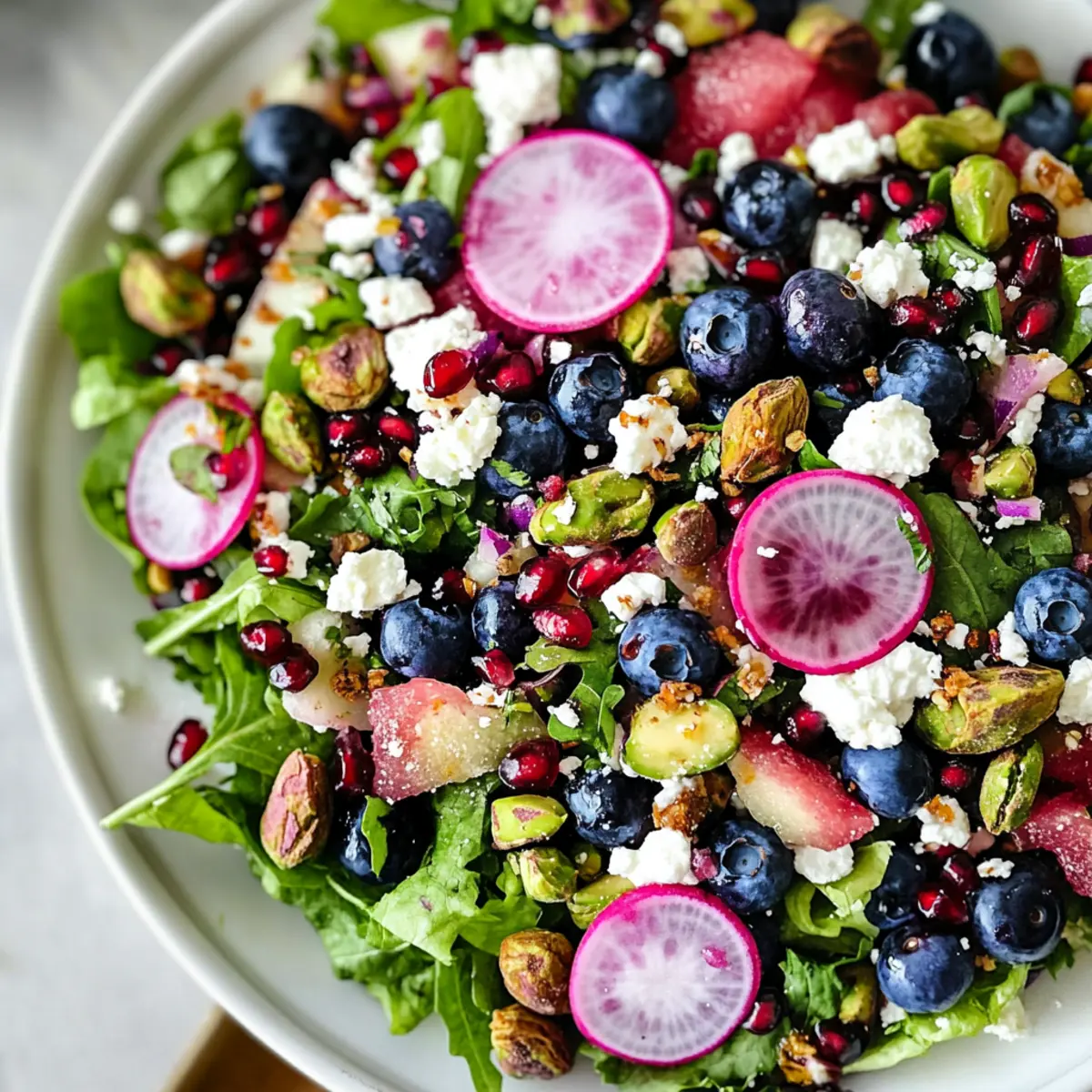- Layer the sliced radish, avocado, and red onion on top of the salad greens. Sprinkle fresh blueberries, pomegranate arils, and candied pistachios over the arranged ingredients. Crumble feta cheese on top.