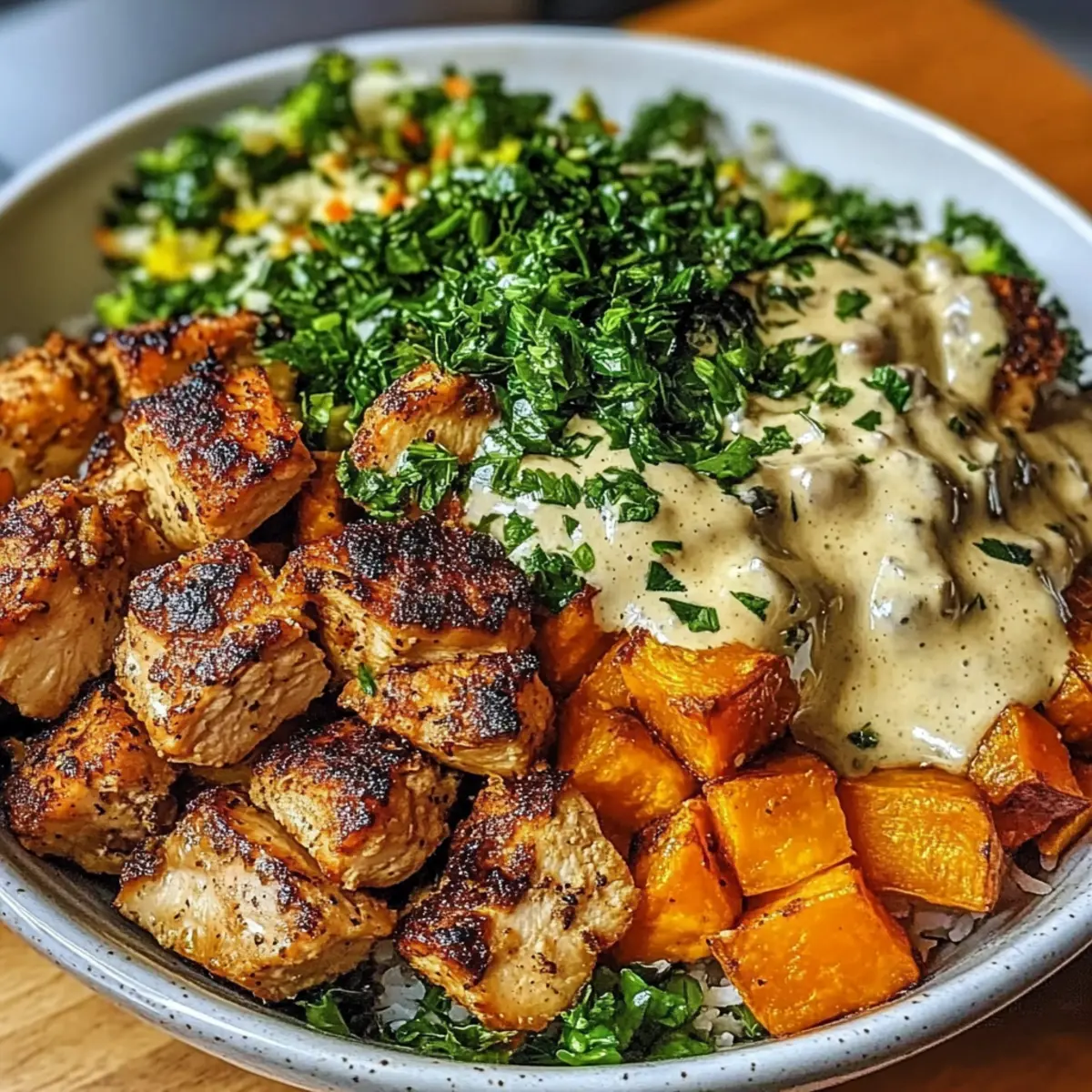 - Assemble the bowls by placing cooked rice in each bowl, then layer on roasted sweet potatoes, chicken, and green vegetables. Drizzle with the creamy sauce and garnish with cilantro or parsley.