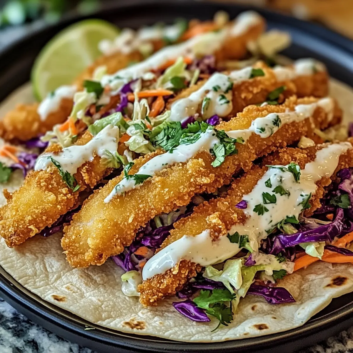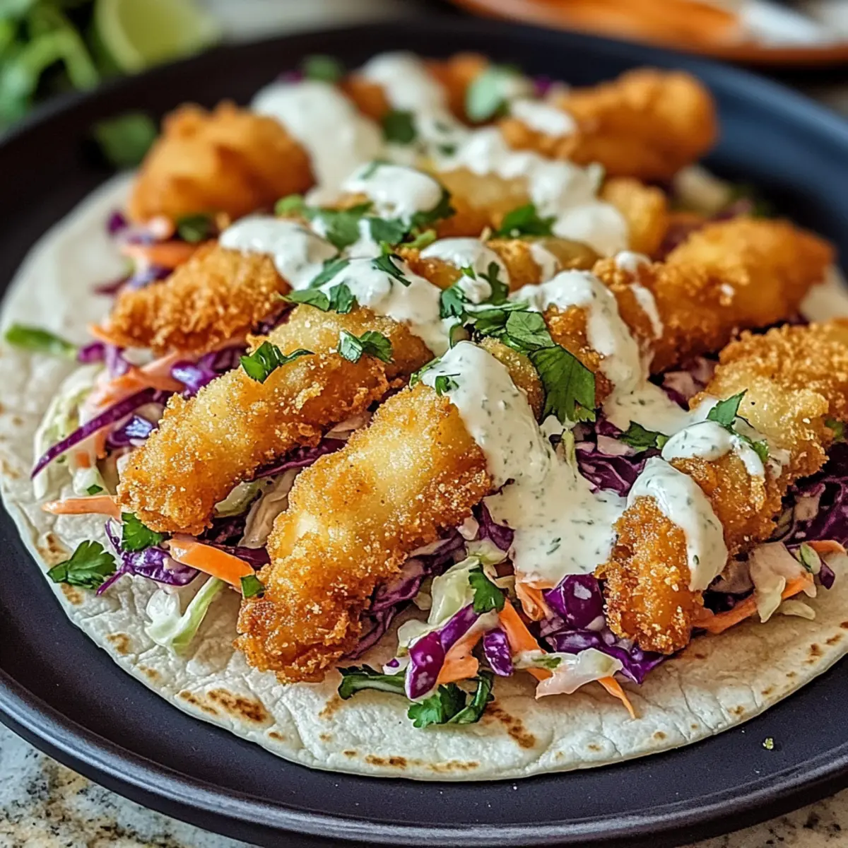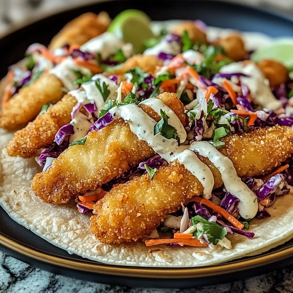 To assemble your Crispy Fish Tacos, place a few crispy fish strips on each warmed tortilla. Top generously with the crunchy slaw and drizzle the zesty lime crema over everything. For added color and flavor, garnish with freshly chopped cilantro. Your taco masterpiece is now ready to enjoy with lime wedges!