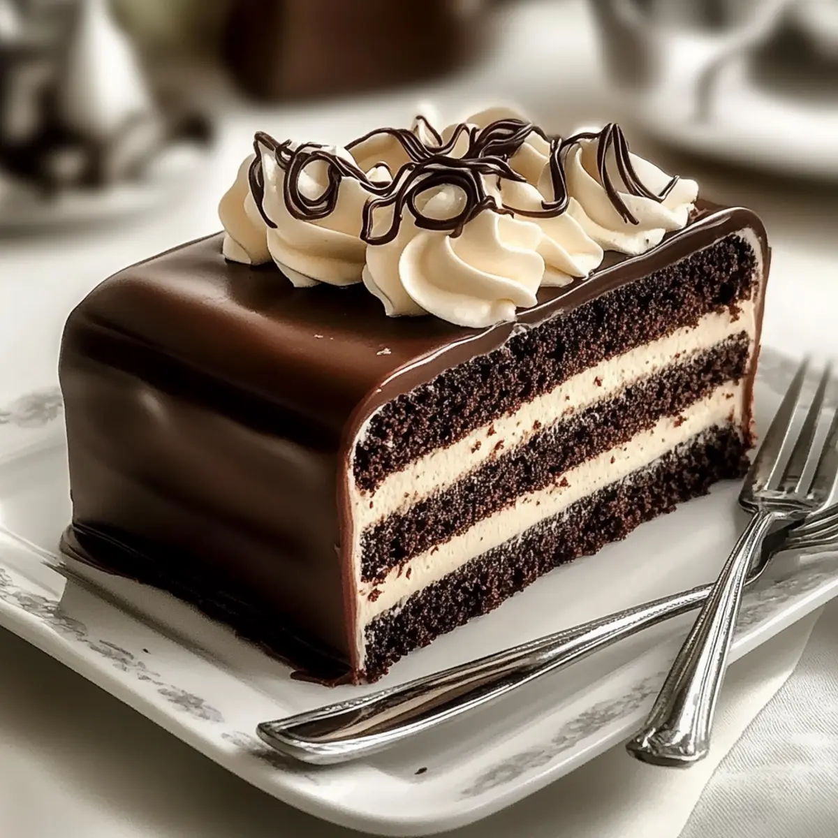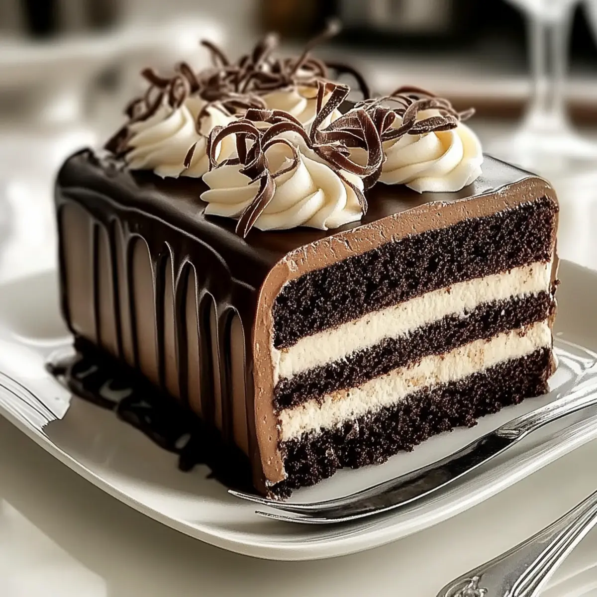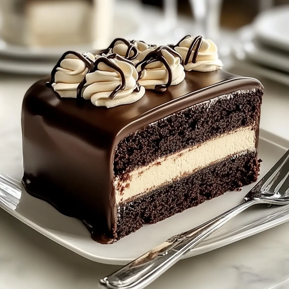 Carefully pour the glossy ganache over the top of the cake, allowing it to cascade beautifully down the sides. Finish your Decadent Tuxedo Bar Cake by decorating with additional frosting, fancy chocolate truffles, and rolled cookie wafers for an eye-catching presentation that will impress your guests.