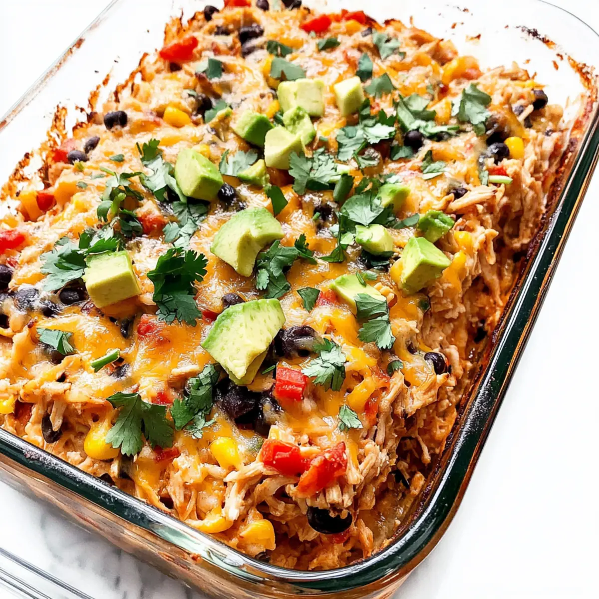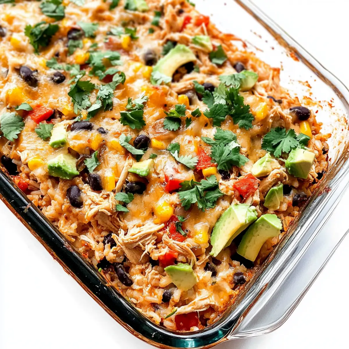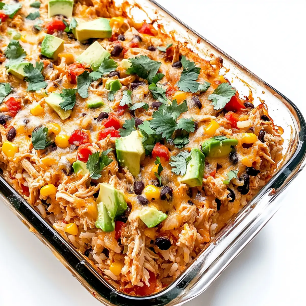 - Let the casserole cool for 5-10 minutes before serving. Top with fresh cilantro, green onion, salsa, or avocado as desired.