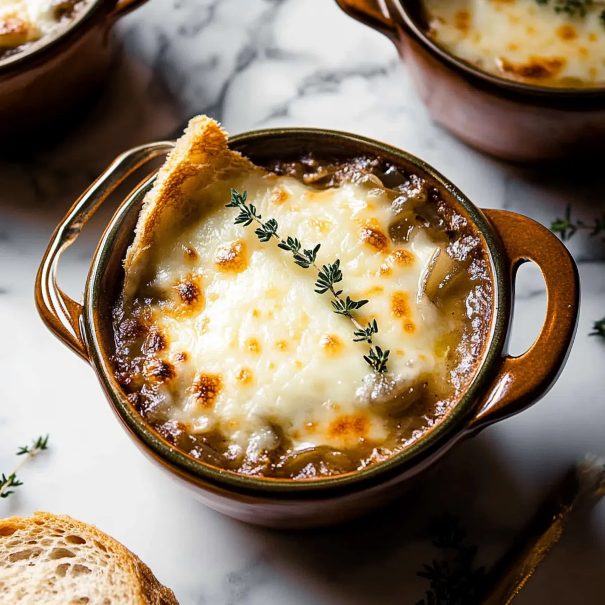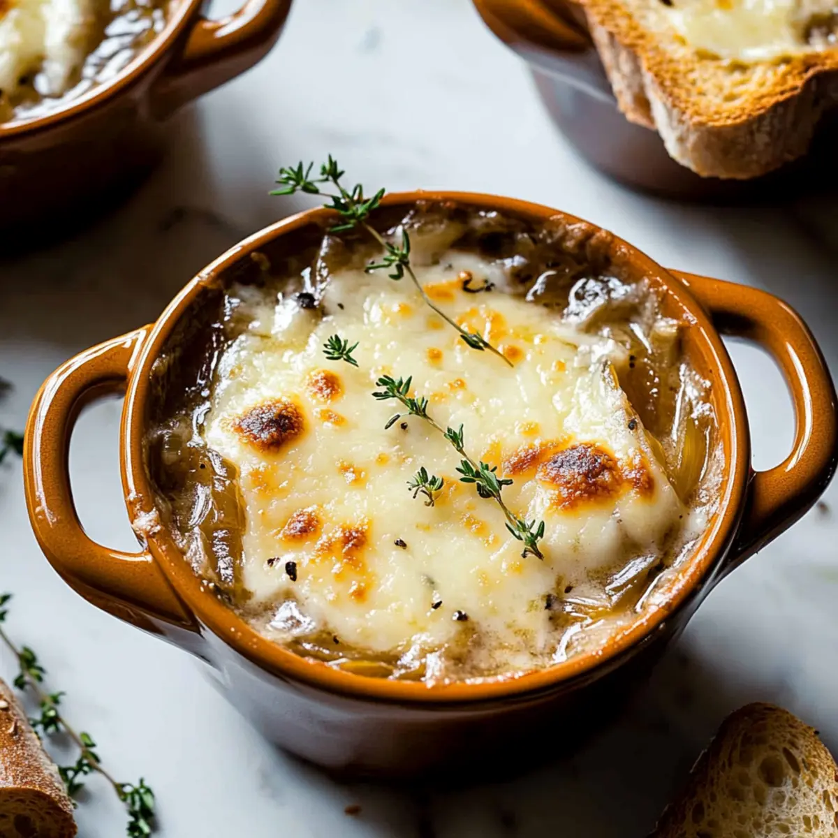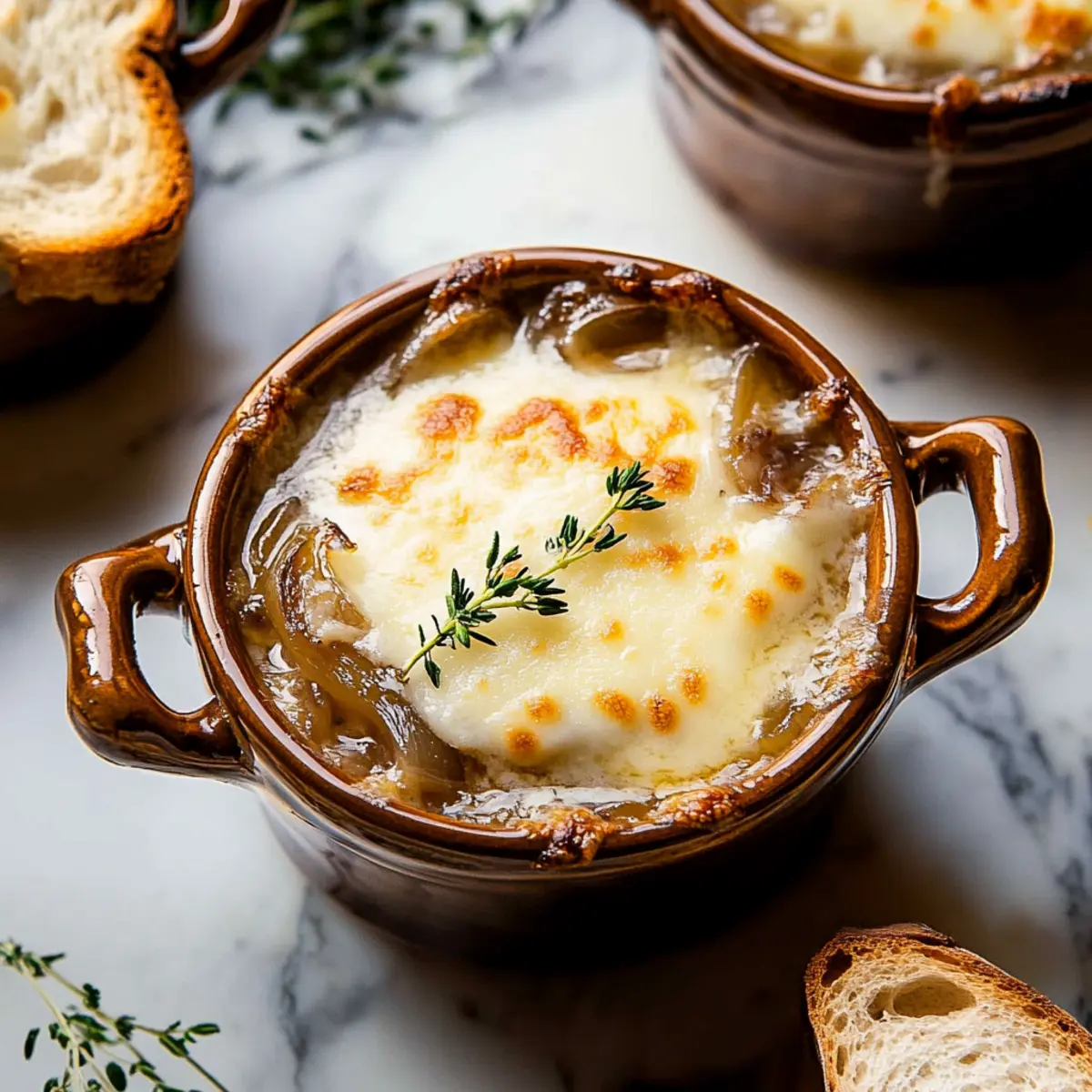 Optional: Add a few fresh thyme leaves on top for a pop of color and extra flavor. Serve your Easy French Onion Soup immediately, pairing it with a light salad or crispy bread for a perfect meal that’s sure to warm your heart and delight your taste buds!