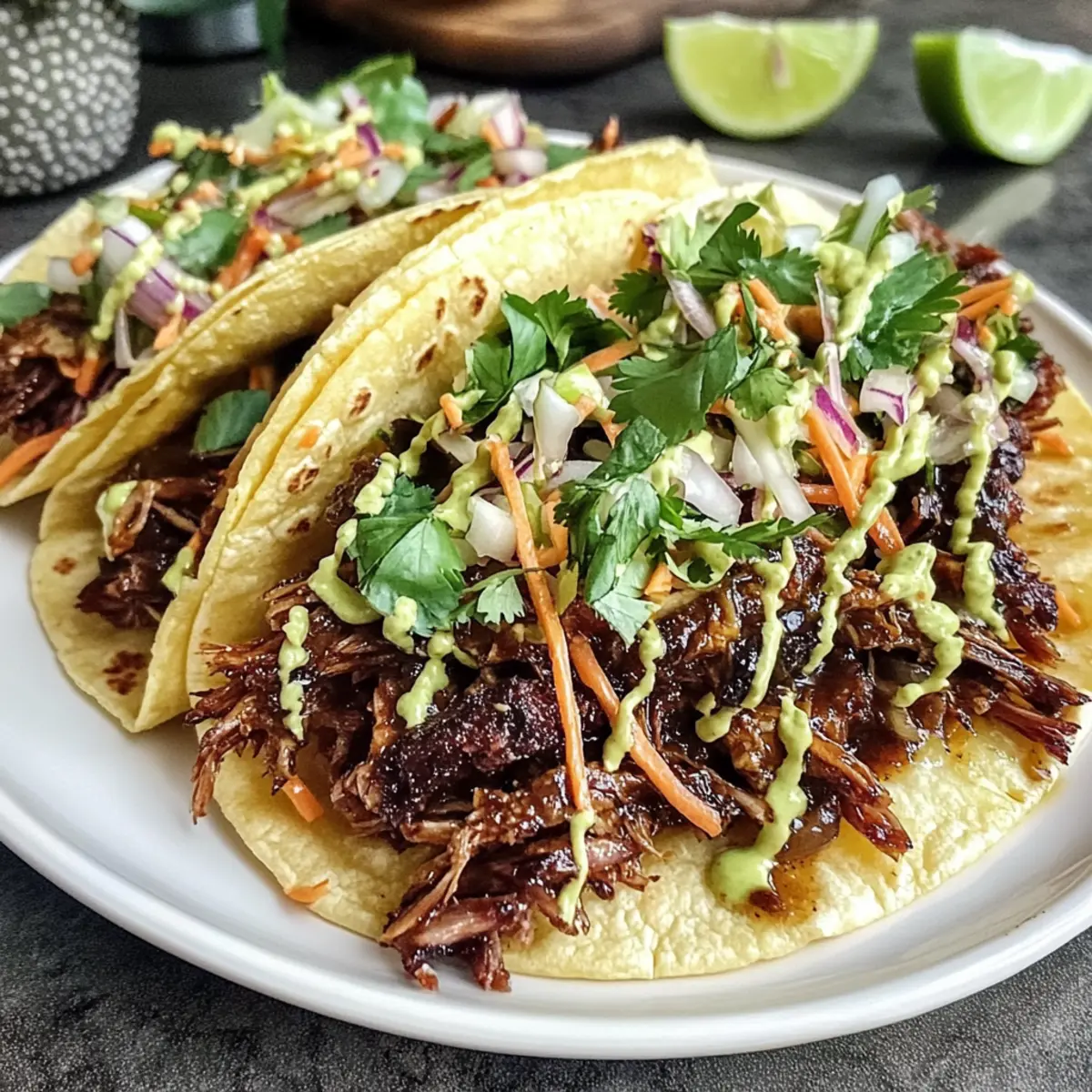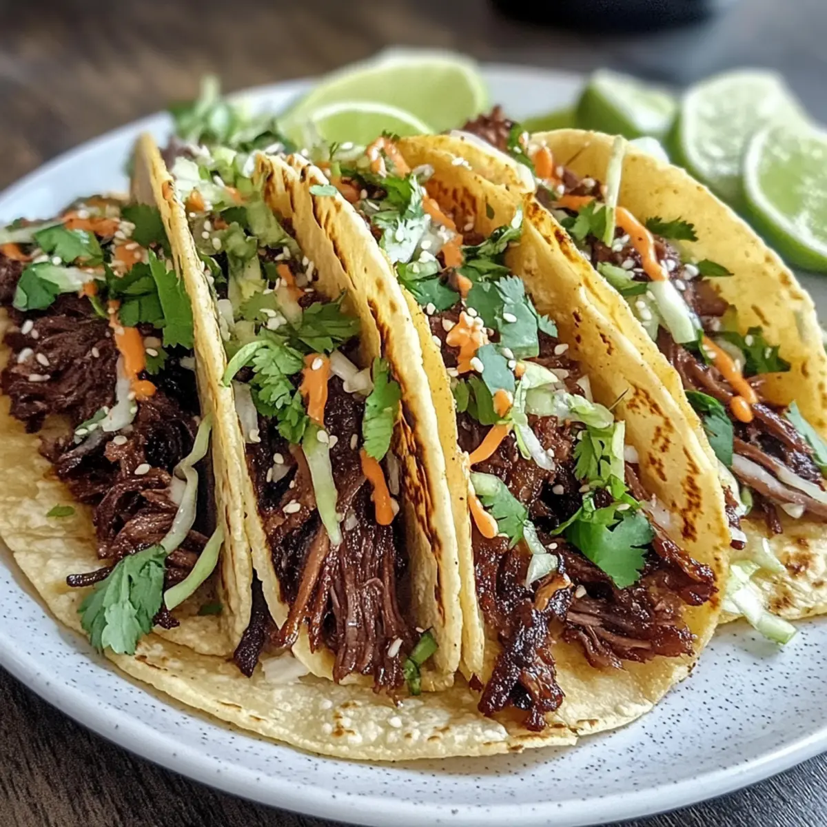 Warm the tortillas in a skillet or microwave until just pliable. Spoon the tender shredded beef into the center of each tortilla, followed by a generous helping of the tangy gochujang slaw. This will not only add a refreshing crunch but also balance the savory flavors of the beef perfectly, making each bite a delight.