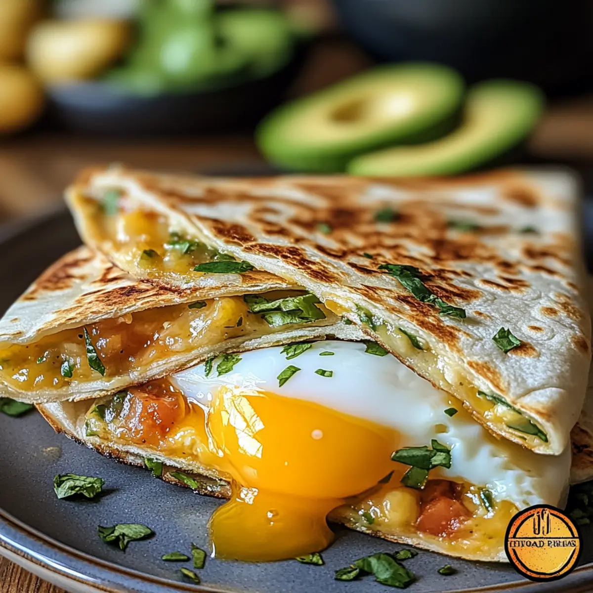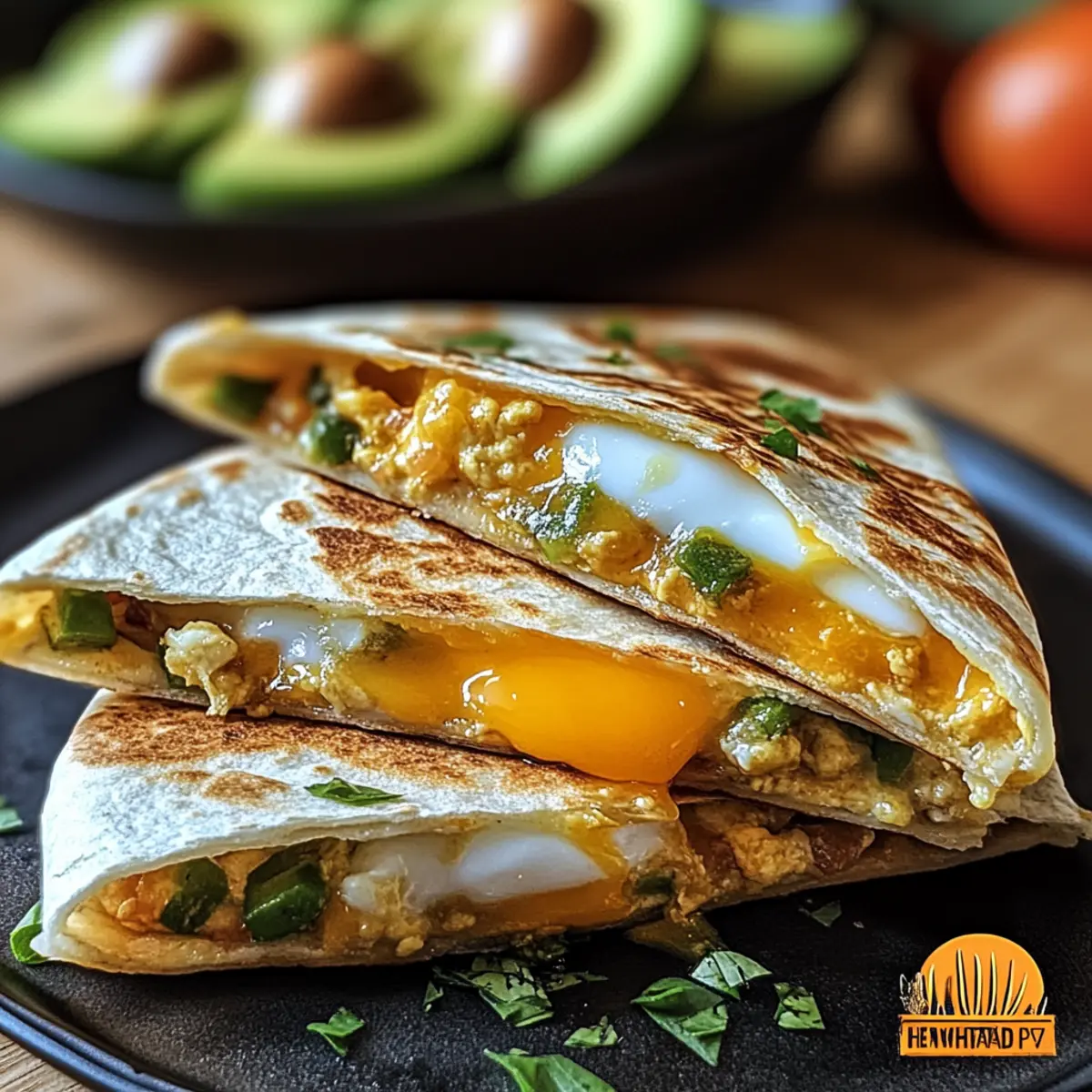 - Layer the fried eggs carefully atop the cheese, followed by sliced avocado. Top with remaining cheese and another tortilla.