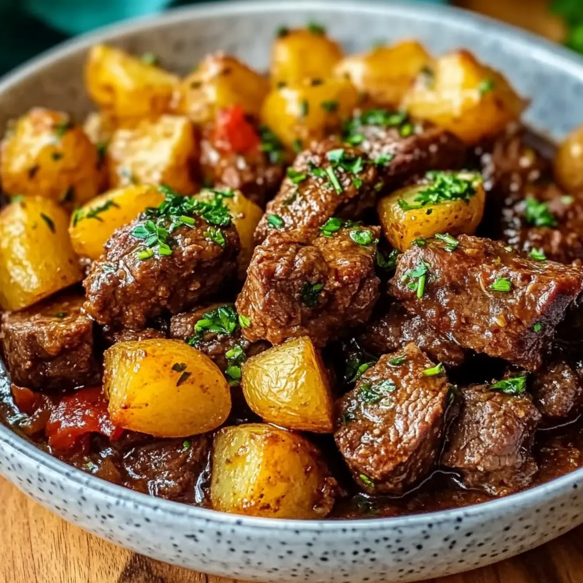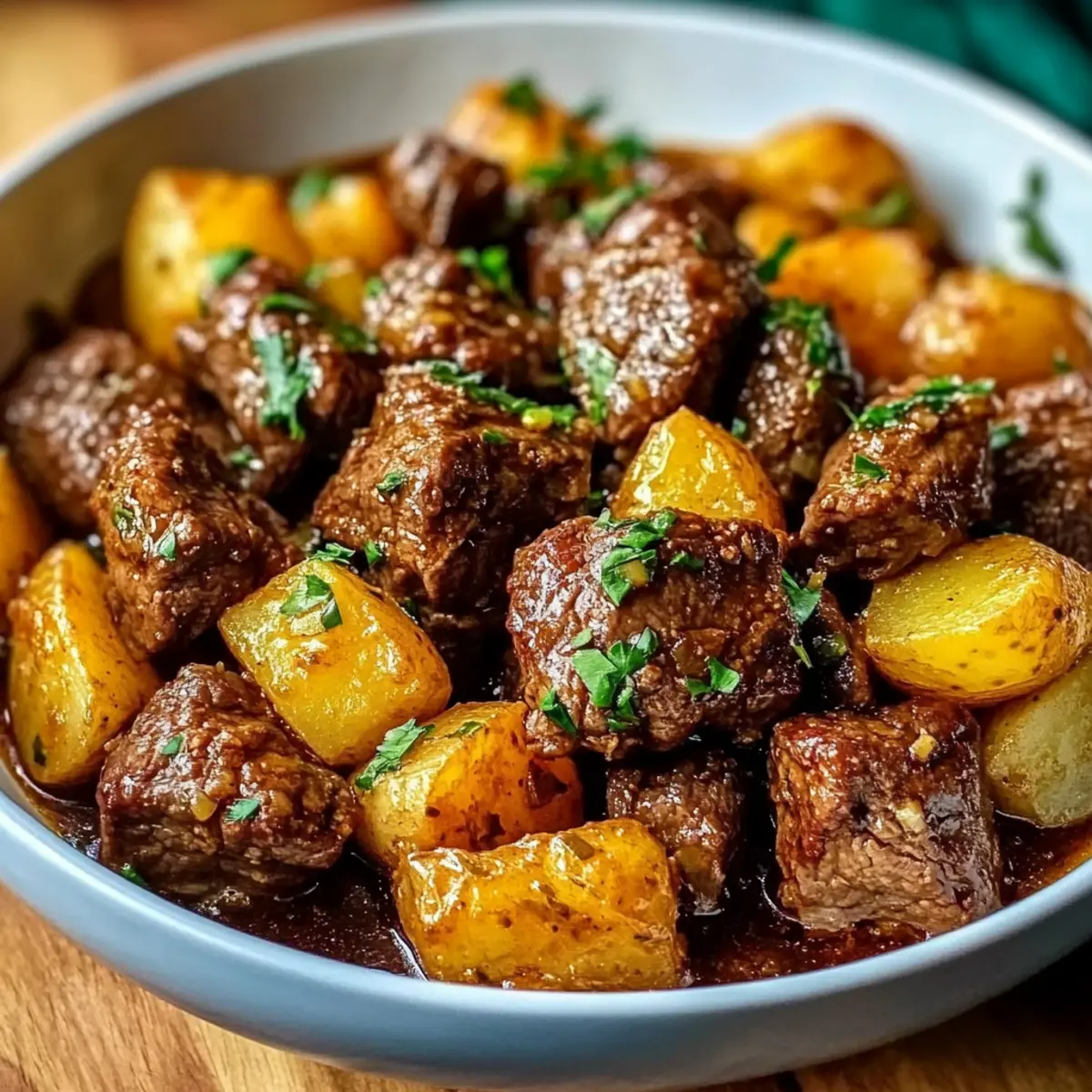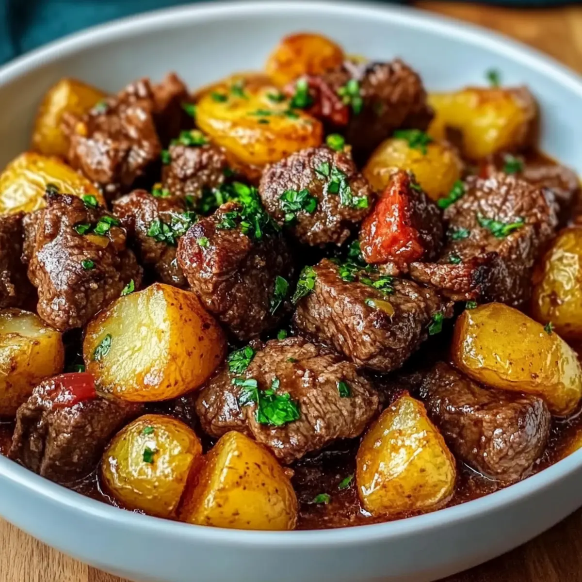 - Pour the garlic butter mixture over the beef and potatoes, gently stirring to combine everything.
