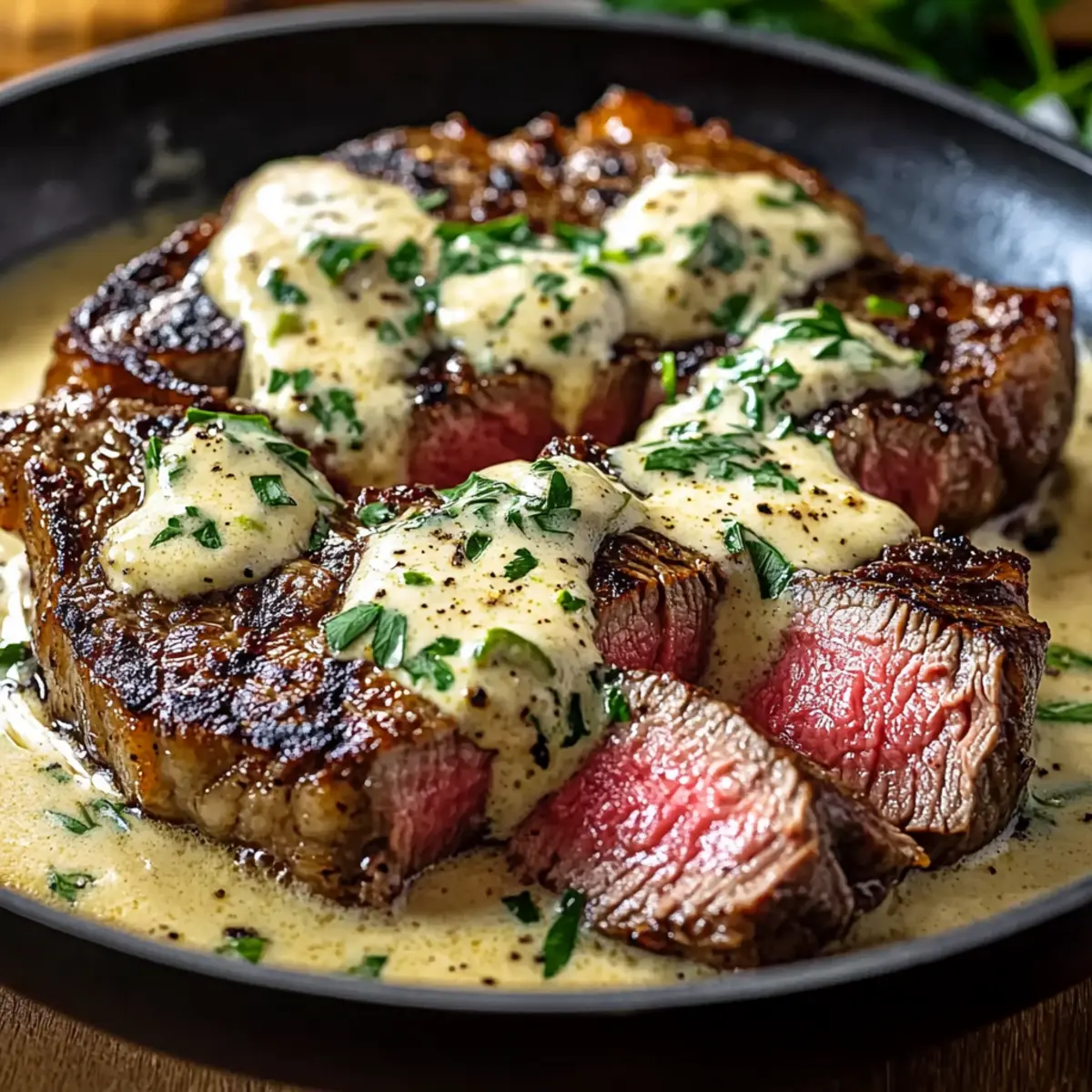 - Slice the rested steaks against the grain and drizzle with the creamy Parmesan sauce. Garnish with freshly chopped parsley.