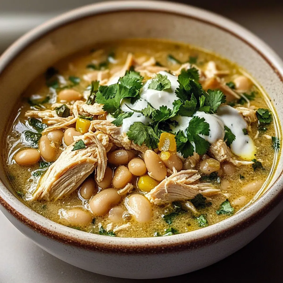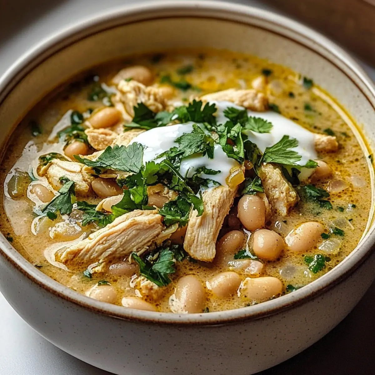 Ladle the warm Ghostly White Chicken Chili into bowls and garnish each serving with fresh cilantro and an extra dollop of sour cream or cheese, if desired. Enjoy this comforting dish hot, perhaps alongside tortilla chips or lime wedges for a truly delightful dining experience!