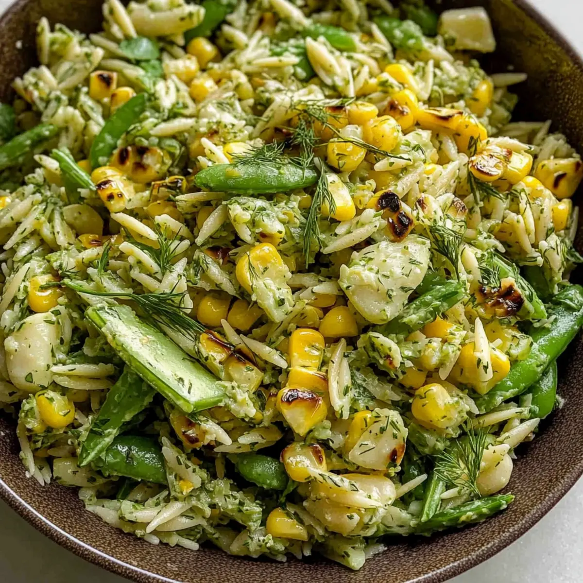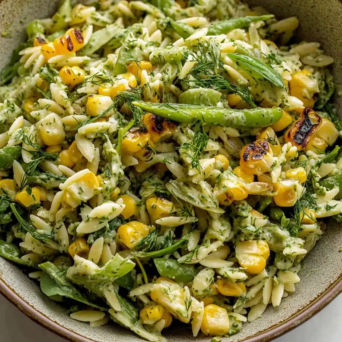 - Assemble the Salad: In a large bowl, combine cooked orzo, grilled corn, scallions, artichoke hearts, edamame, and arugula. Toss with the creamy dressing until well mixed.