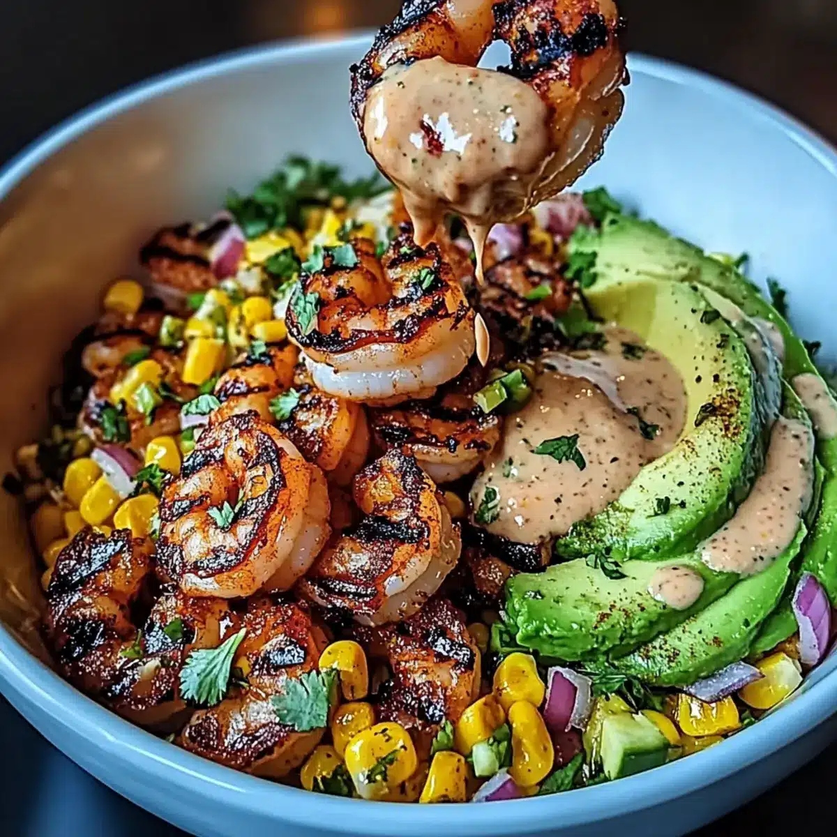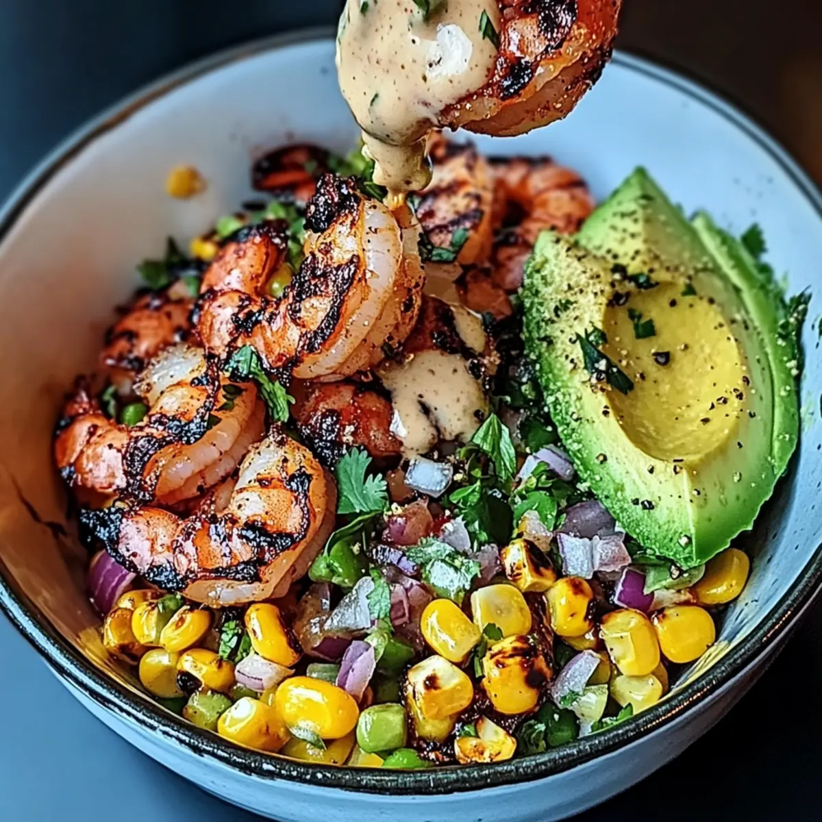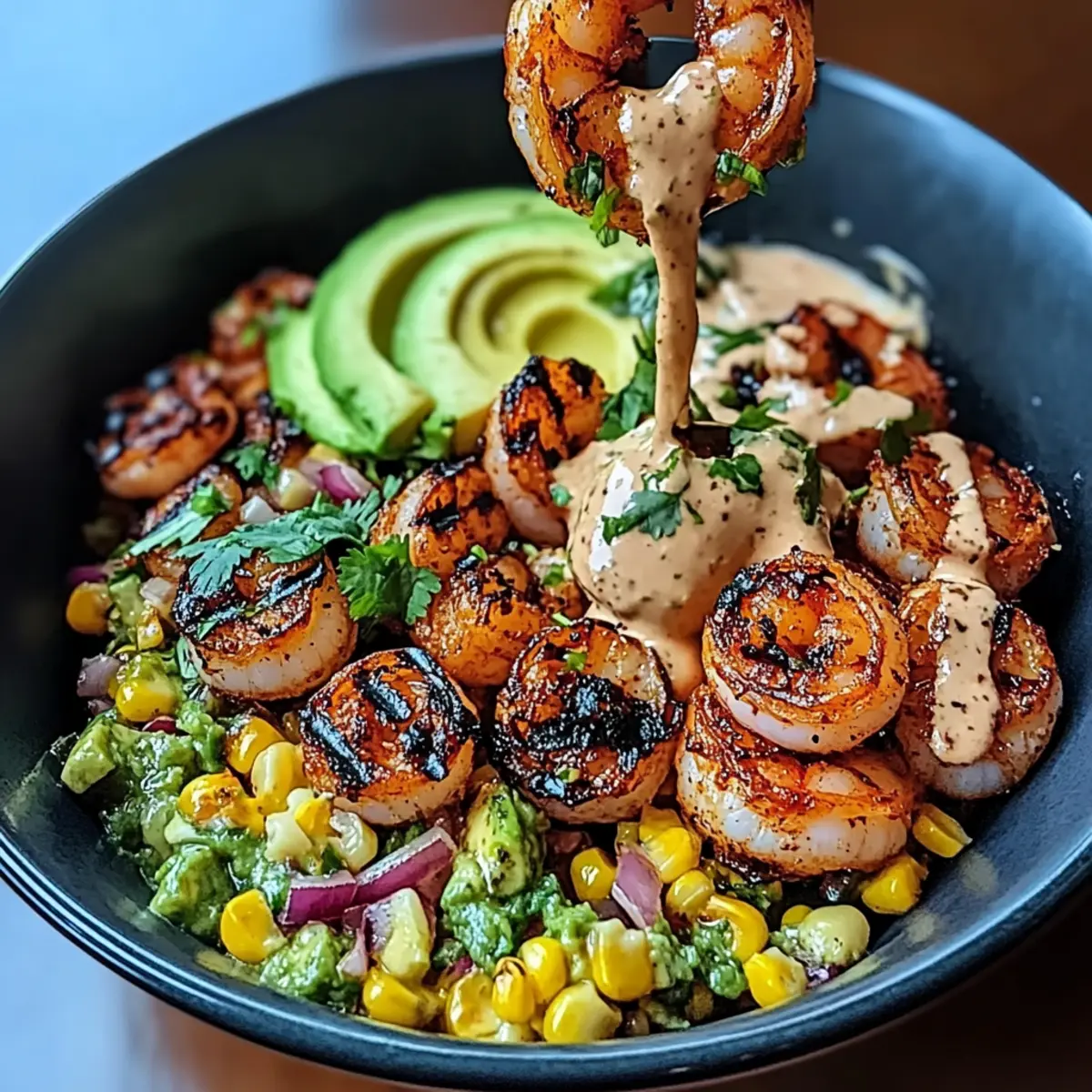 - Assemble the bowl by layering corn salsa, grilled shrimp, creamy sauce, and avocado; garnish with sesame seeds and green onions.