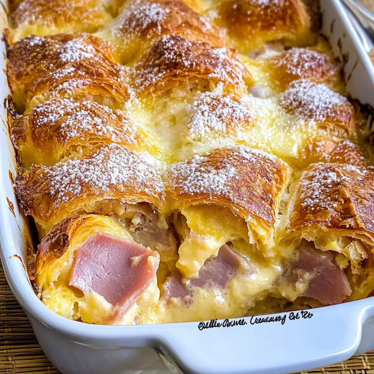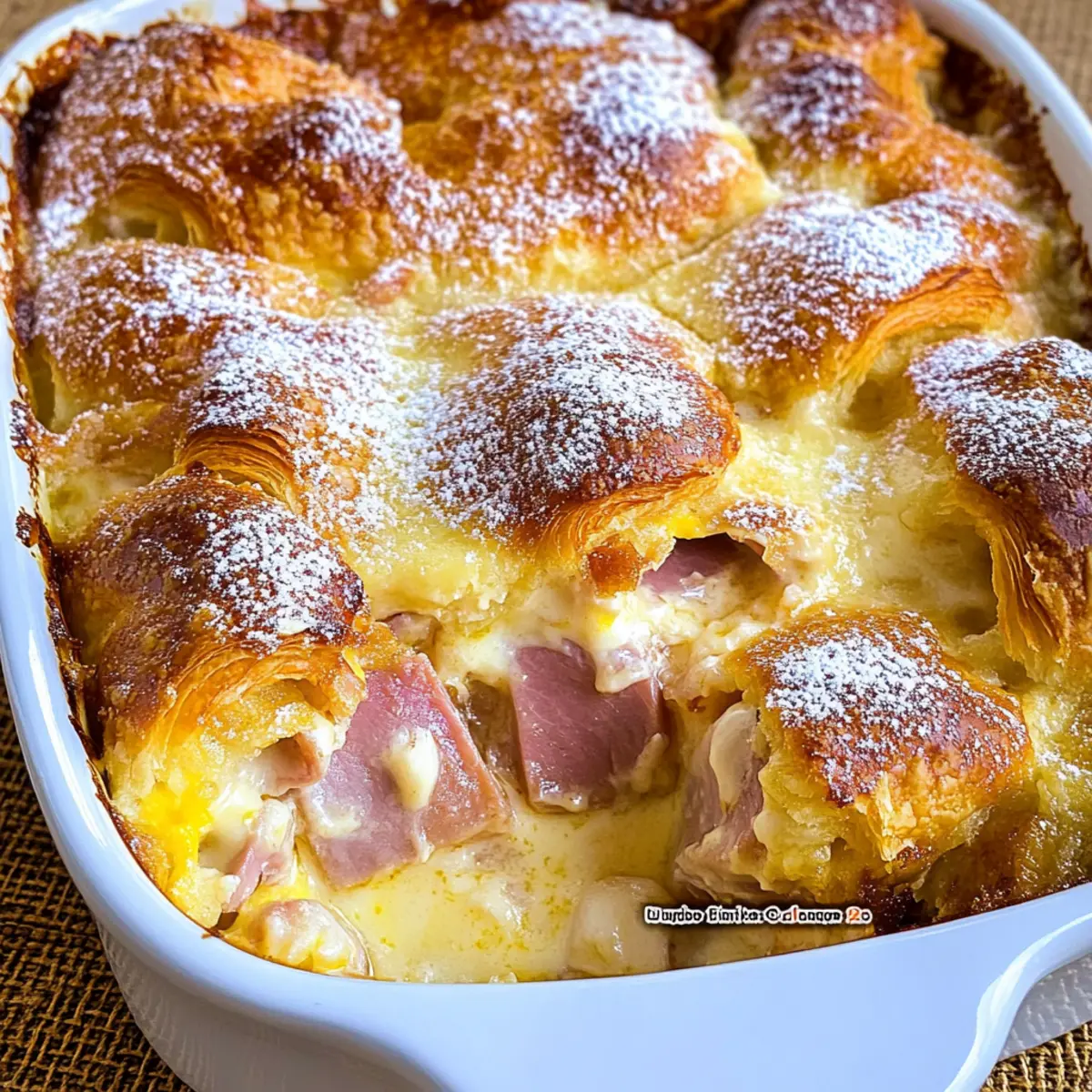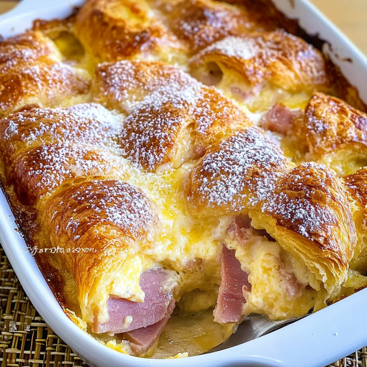 Serving Suggestions: Dust with powdered sugar just before serving for a beautiful presentation that contrasts the savory flavors of the Ham and Cheese Croissant Breakfast Casserole.