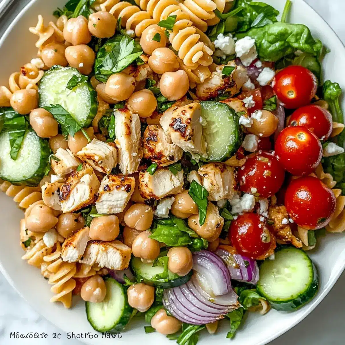 In a large mixing bowl, combine the cooled pasta with diced grilled chicken, drained and rinsed chickpeas, and either edamame or green peas for a protein boost. Add halved cherry tomatoes, diced cucumber, and finely chopped red onion for freshness. If you’re using feta cheese and sunflower seeds, fold them in gently to avoid crushing the ingredients.