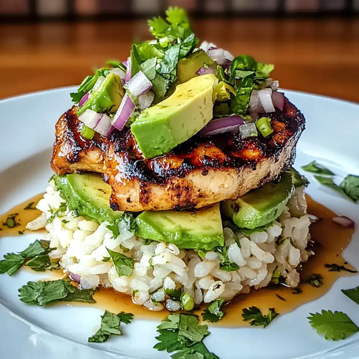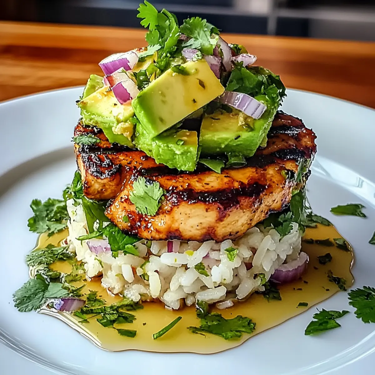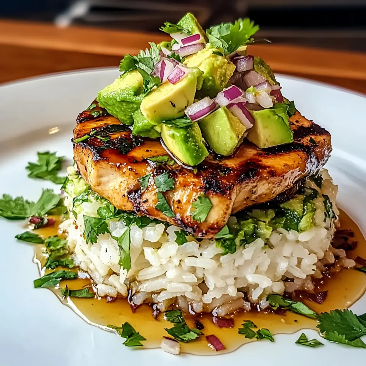 - Assemble the Stack: Layer jasmine rice on a plate, top with grilled chicken slices, and spoon the avocado mix over.