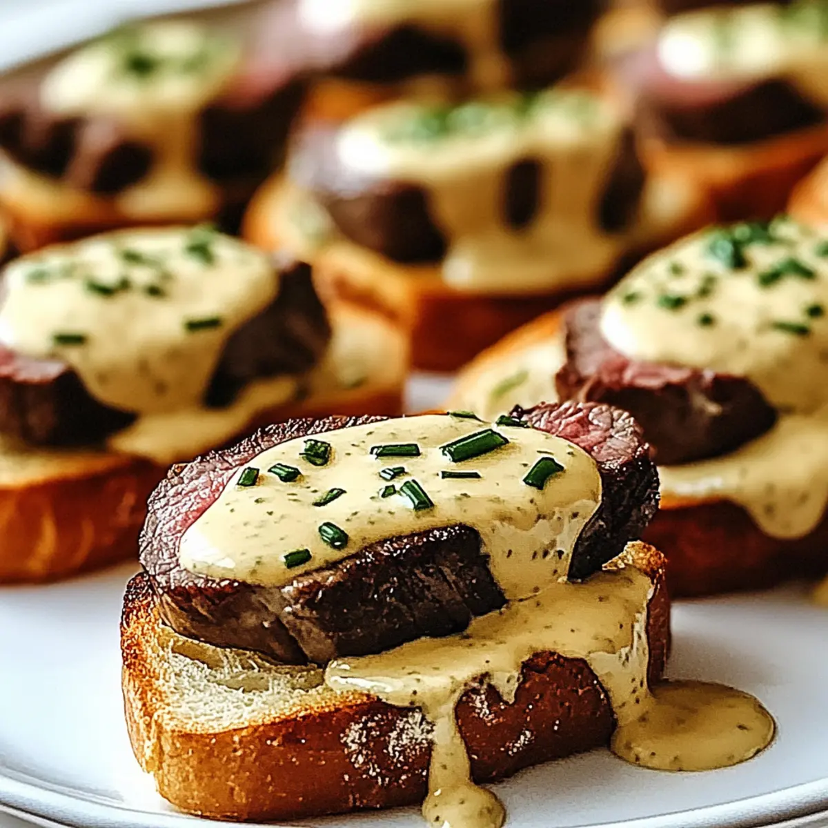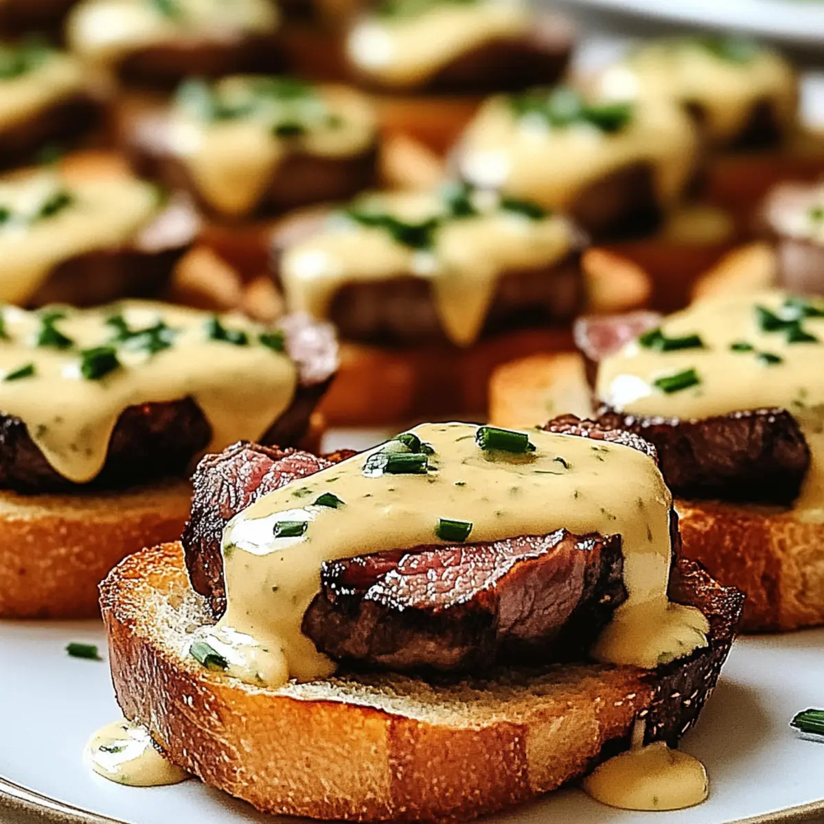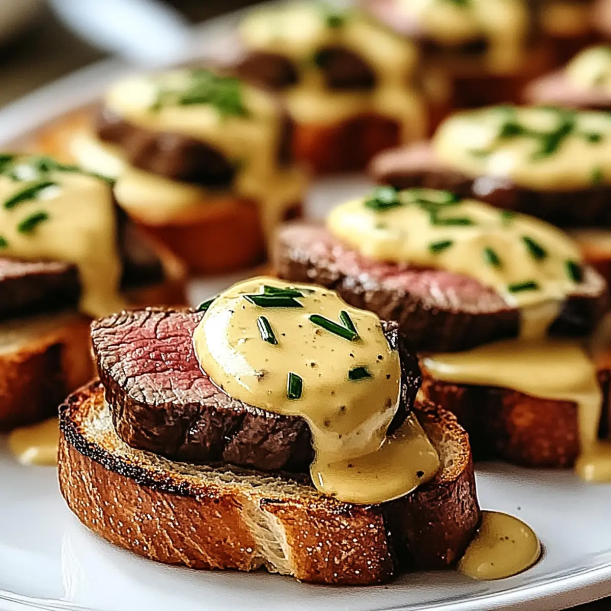 - Assemble the Crostini: Layer a slice of the grilled beef on each toasted baguette piece, drizzle with Béarnaise sauce, and sprinkle fresh chives on top.