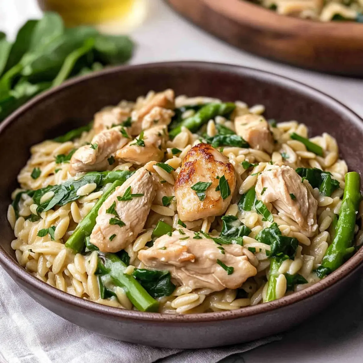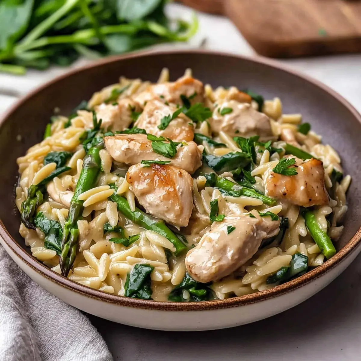 Once the orzo is tender, stir back in the cooked chicken, sautéed asparagus, and half-and-half. Add grated Parmesan cheese, fresh baby spinach, and thyme to the skillet, stirring until the spinach wilts and the cheese melts, which should take about 1-2 minutes. This step creates a creamy, flavorful texture that makes this dish truly comforting.