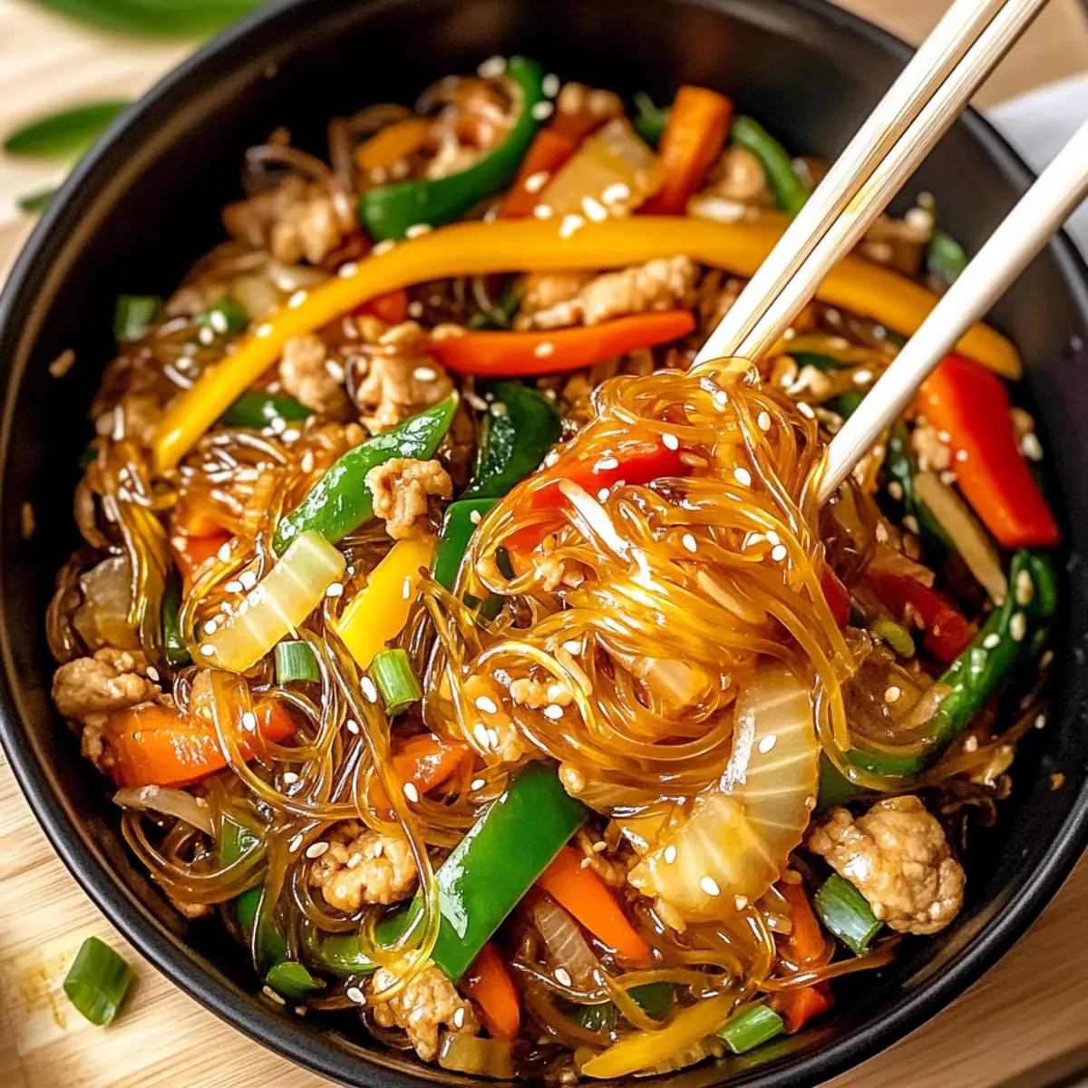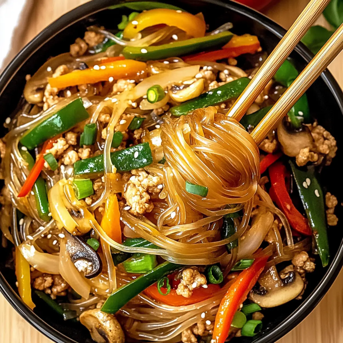 As I stirred the vibrant colors of vegetables and savory ground chicken, a wave of nostalgia washed over me. This Korean Glass Noodle Stir Fry has become my go-to dish for busy weeknights when I crave something comforting yet light. It’s not just quick and easy; it’s a gluten-free triumph that packs a protein punch! The delightful chewiness of the glass noodles entwines with the sweetness of colorful bell peppers and the rich umami flavor of shiitake mushrooms, creating a harmony of tastes that satisfy even the pickiest eaters. And let’s not forget about the leftovers – they taste even better the next day! Ready to dive into this culinary adventure? Grab your skillet, and let’s make a meal that will leave your family asking for seconds!