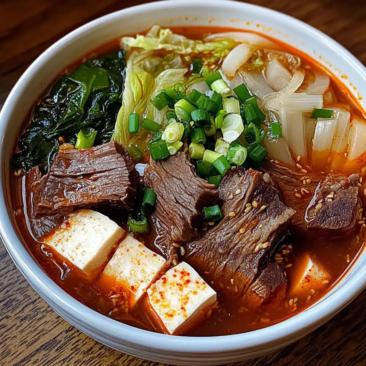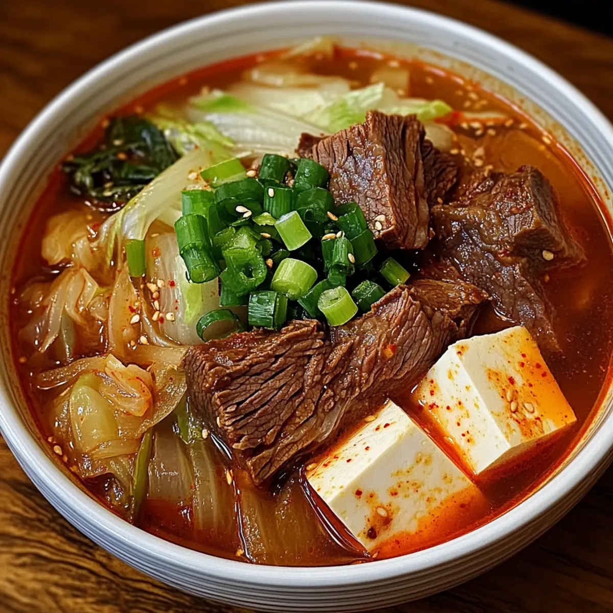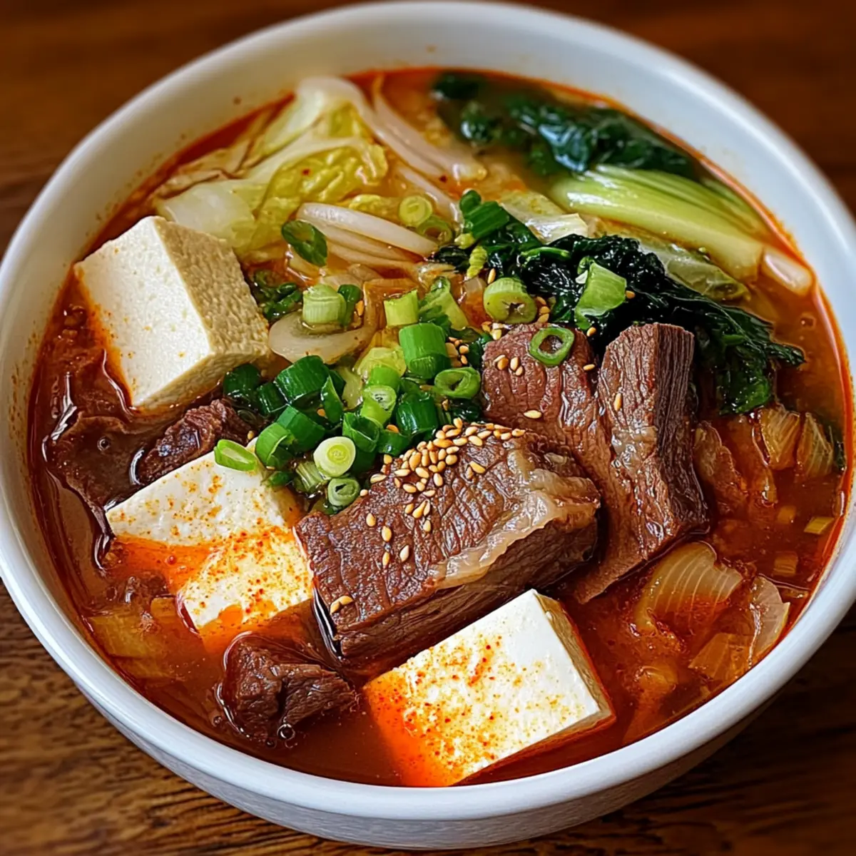 Ladle the steaming soup into bowls, ensuring an even distribution of beef, vegetables, and silky tofu. Accompany with a generous scoop of cooked white rice on the side, allowing everyone to soak up the delicious broth. Garnish with more green onions for a pop of color and freshness as you invite everyone to gather around for a warm, comforting meal.
