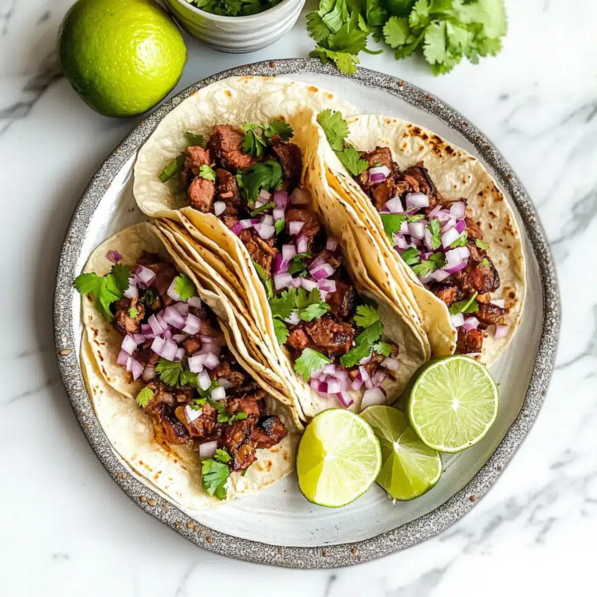 Once the steak is cooked and resting for a moment, slice it thinly against the grain to enhance tenderness. Begin assembling your tacos by placing a generous portion of the sliced carne asada in each warmed tortilla. Top with diced red onion and a handful of chopped fresh cilantro. Finish with a squeeze of fresh lime juice, adding that zesty brightness that elevates these authentic Mexican street tacos to perfection.
