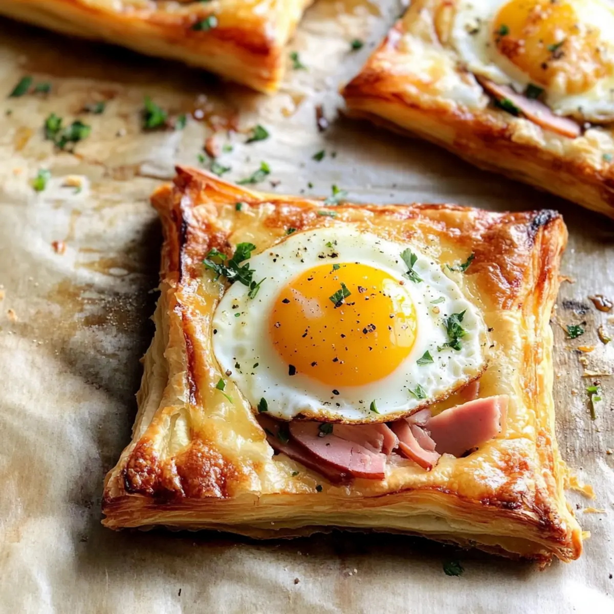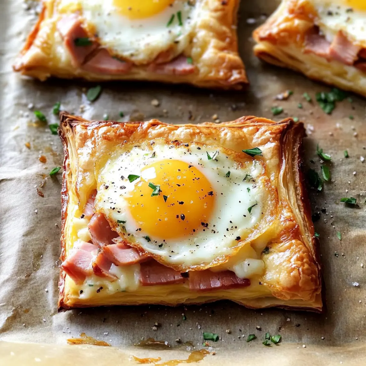 - Layer slices of ham evenly on each pastry square, allowing space in the center for the eggs. Sprinkle grated gruyère cheese over the ham. Bake in the preheated oven for 10-15 minutes, until the pastry edges begin to turn golden.