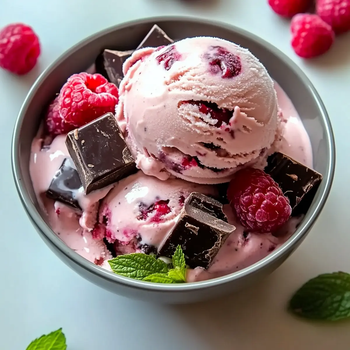 - Scoop the ice cream into bowls or waffle cones and optionally top with fresh mint or raspberries.