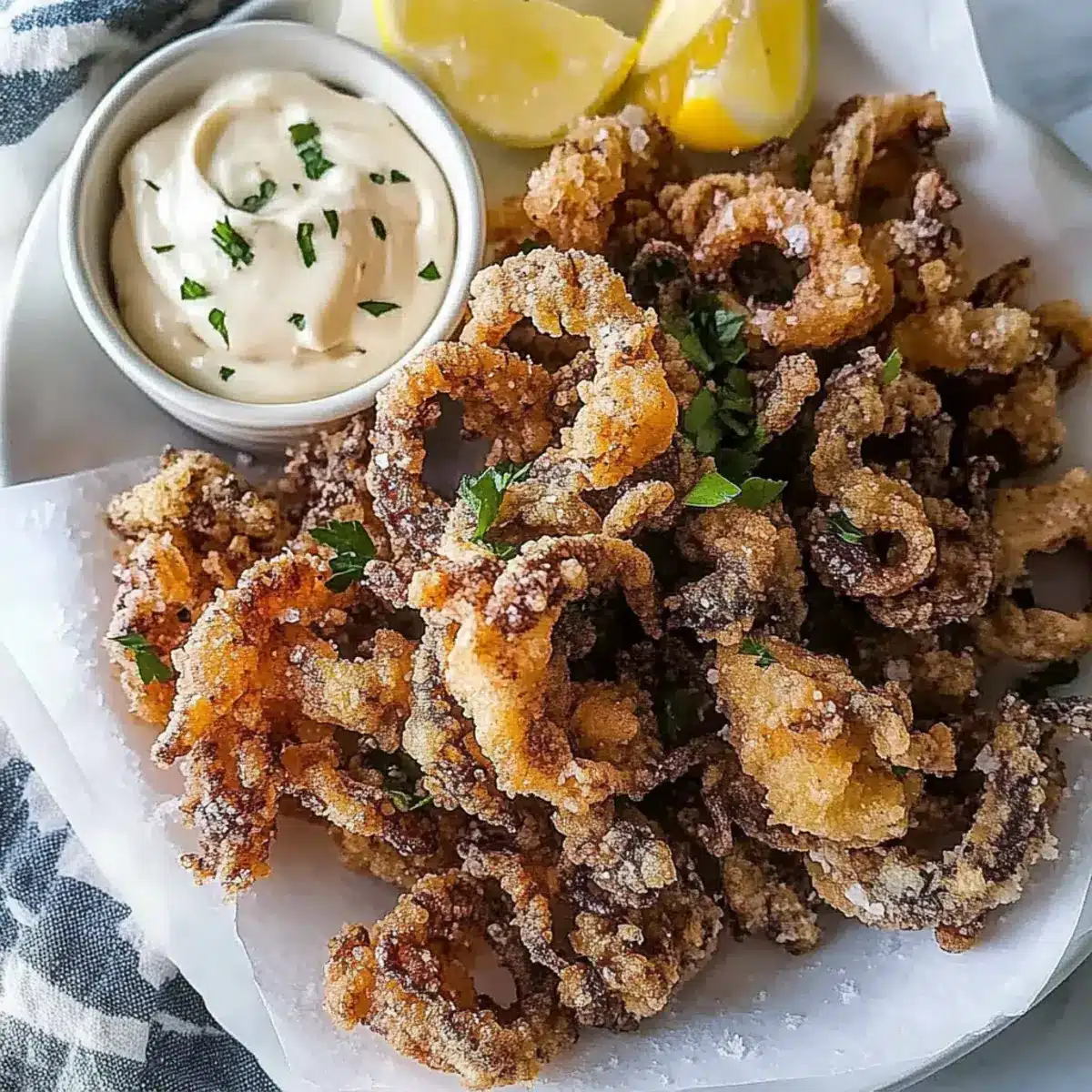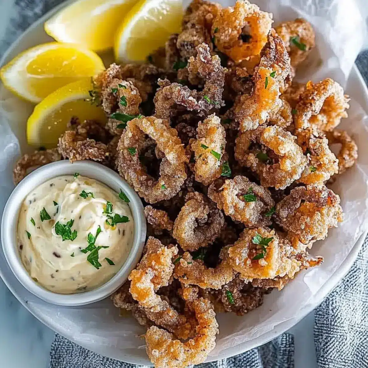 Certainly! This recipe can easily accommodate gluten-free diets by substituting regular flour with gluten-free flour. Additionally, the mayonnaise can be swapped with Greek yogurt for a healthier dip. Just be cautious if you’re serving this to pets or individuals with shellfish allergies, as squid is a type of seafood that could trigger allergic reactions. Always consult with your guests about any dietary restrictions to ensure everyone enjoys this dish!