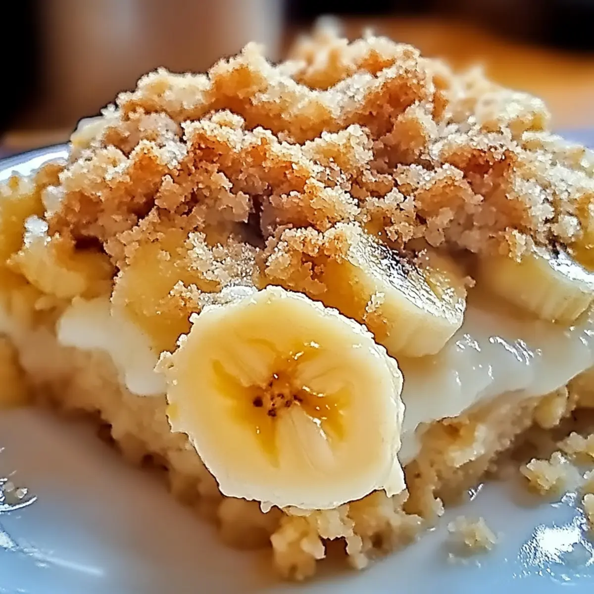 Generously sprinkle the streusel topping over the sliced bananas, ensuring an even distribution across the entire surface. The streusel will bake to a golden brown, providing a delicious contrast to the soft banana filling below. Get ready for the sweet aroma to fill your kitchen as it bakes!