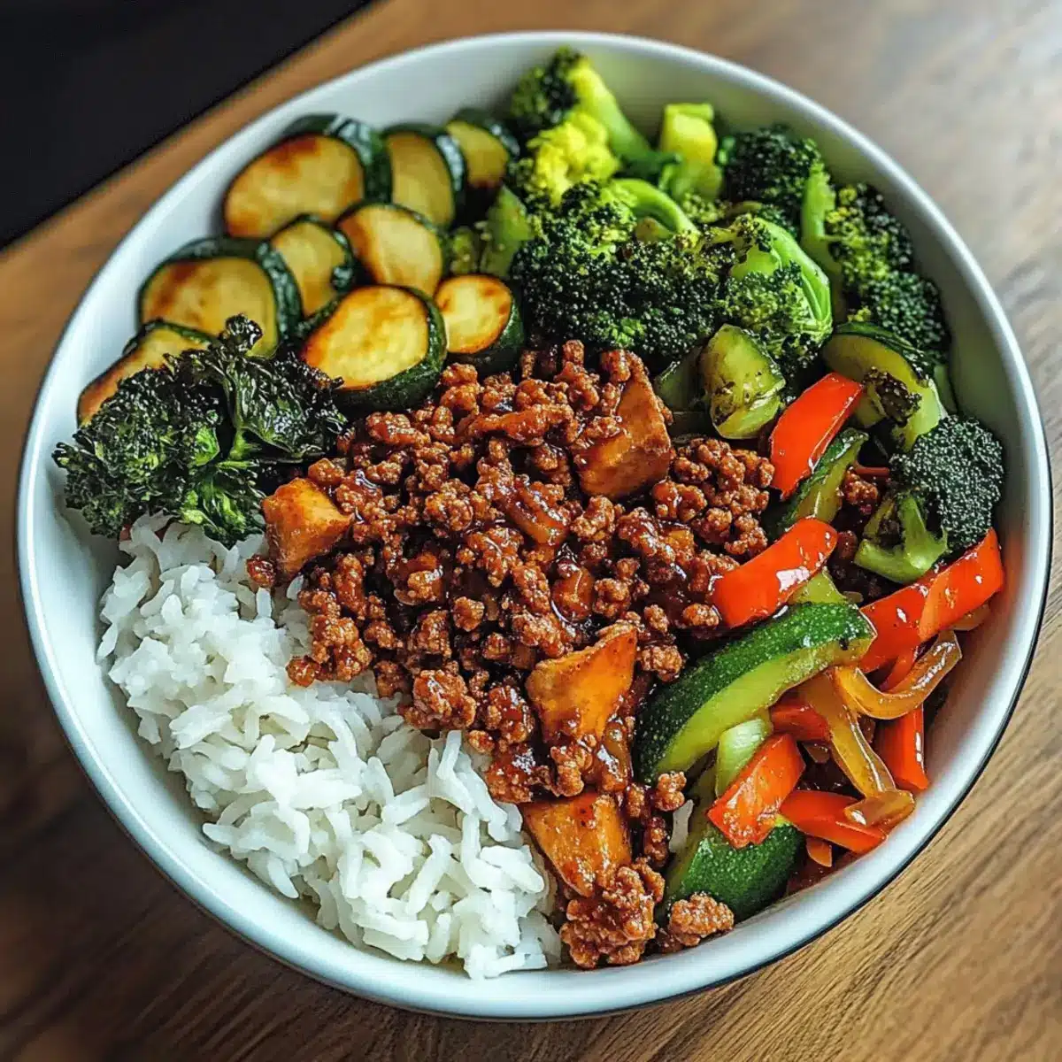 - Assemble bowls with rice, top with beef mixture and sautéed veggies. Drizzle with soy sauce if desired.