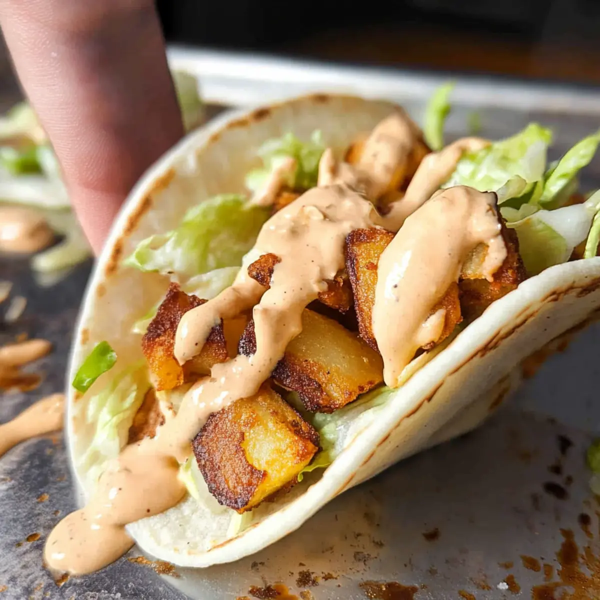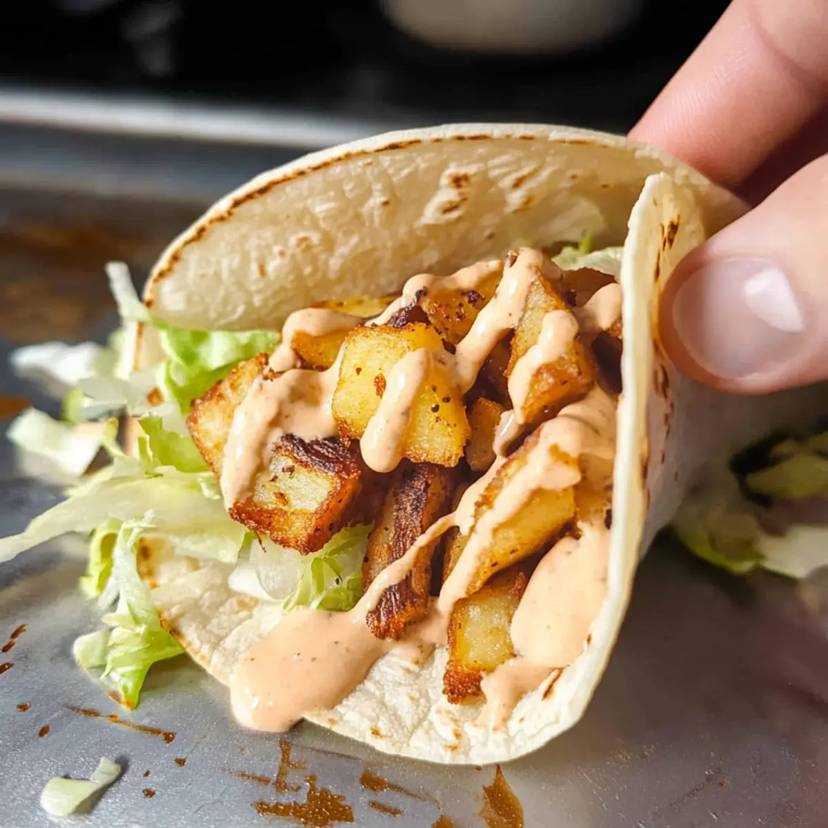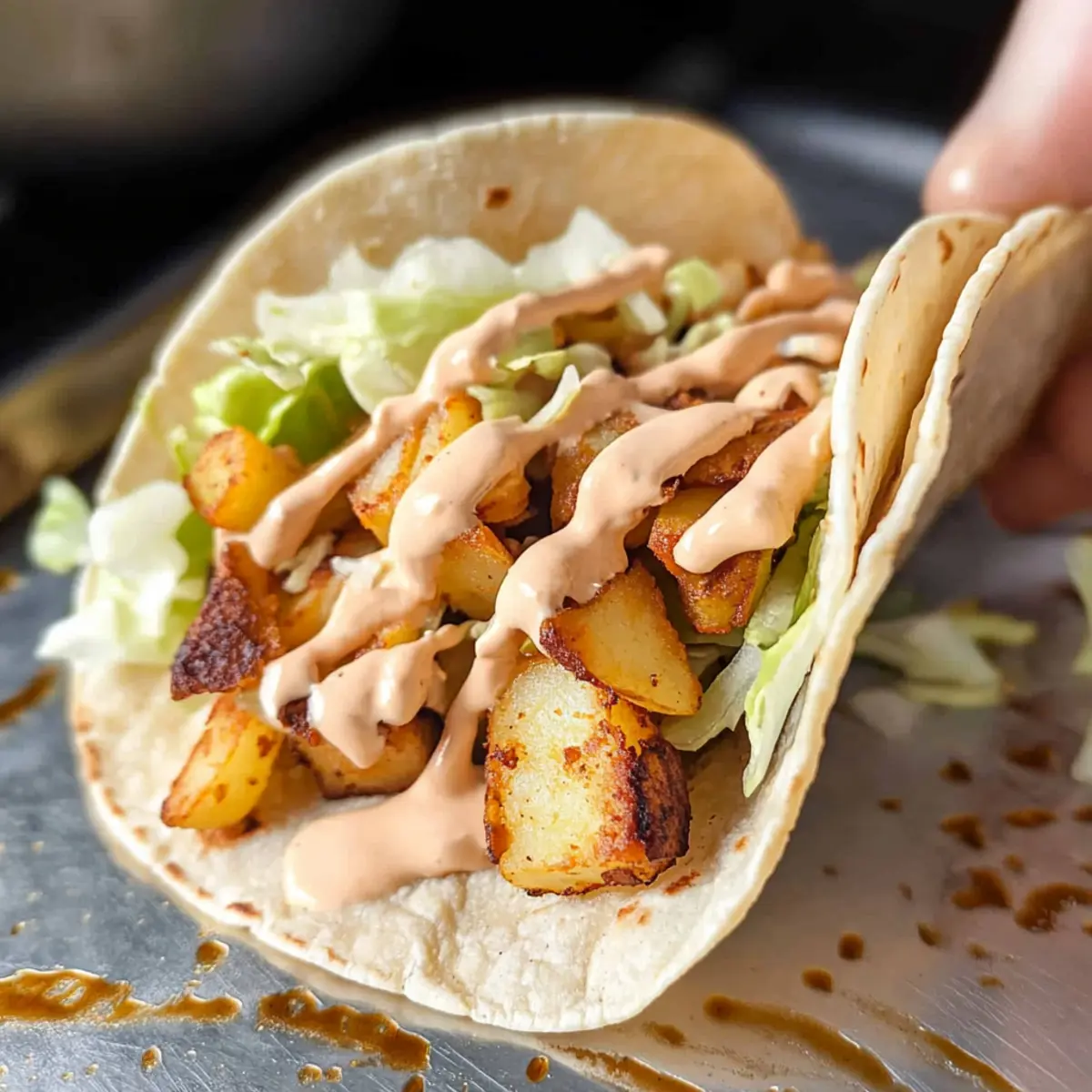- Assemble tacos by adding roasted potatoes, drizzling sauce, and adding toppings before folding.