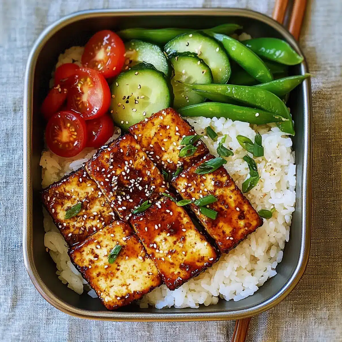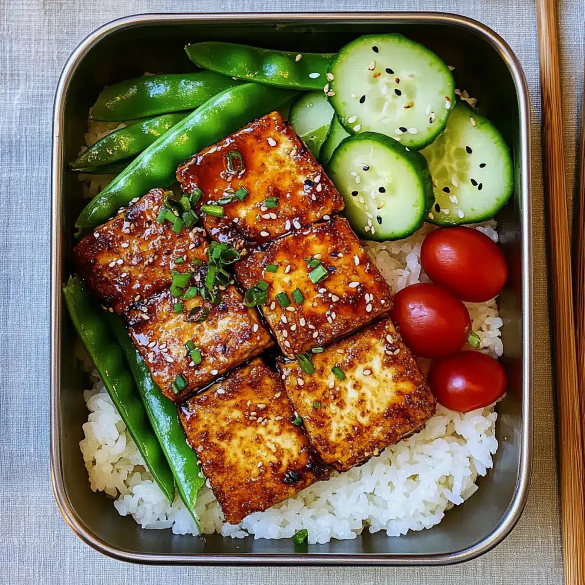 - Assemble the bento by layering rice, topped with teriyaki tofu, cucumber salad, blanched peas, and cherry tomatoes. Garnish with sesame seeds.
