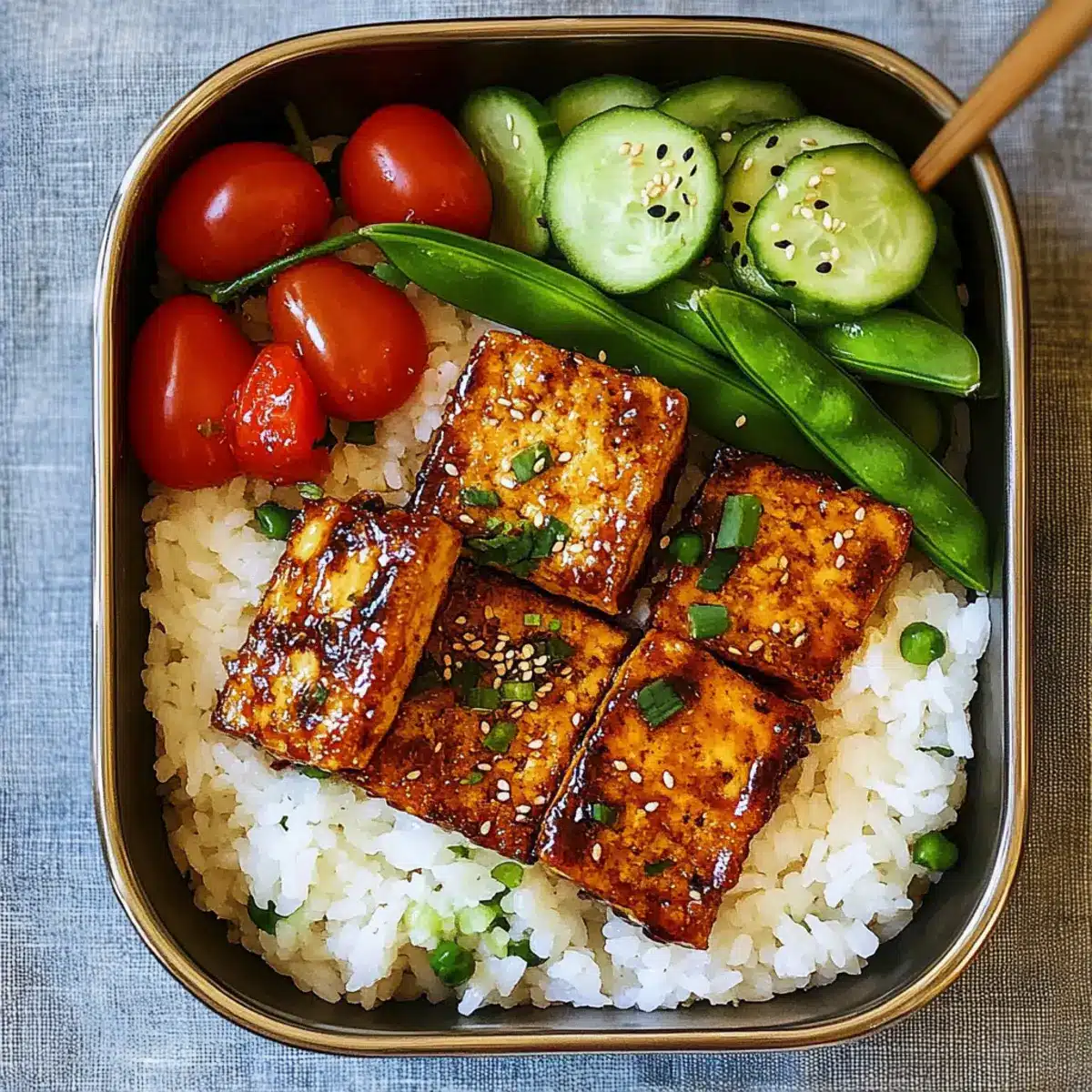 Preparing the Tofu Teriyaki Bento Box ahead of time is a fantastic way to save precious moments on busy weekdays! You can prep the rice and cucumber salad up to 24 hours in advance; simply store them in airtight containers in the refrigerator to maintain their freshness. For the tofu, after frying, allow it to cool completely before coating it in teriyaki sauce, and refrigerate it for up to 3 days. When you’re ready to serve, simply reheat the tofu in a skillet over medium heat until warmed through, and assemble the bento boxes with the fresh sides. This way, every bite remains delicious and satisfying, allowing you to enjoy fantastic homemade meals even on the go!