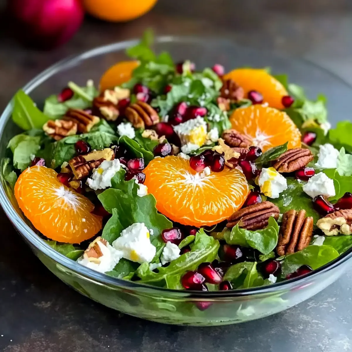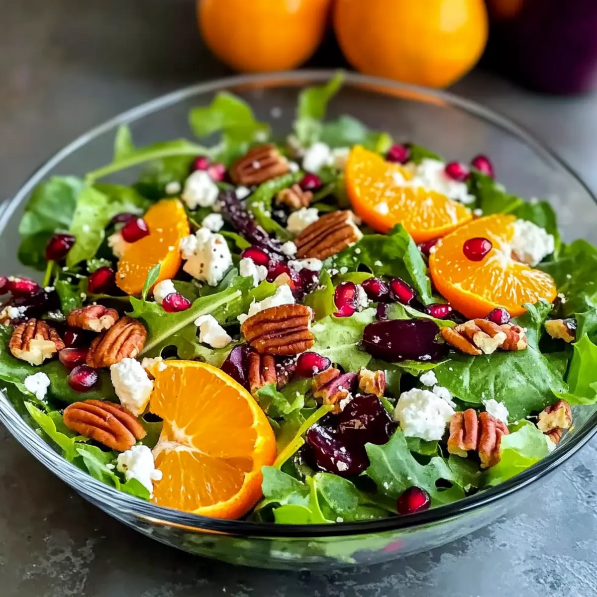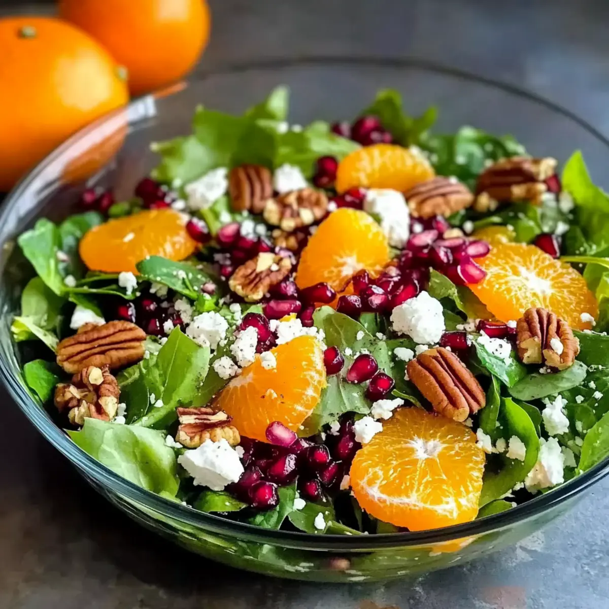 - In a large mixing bowl, combine the mixed spring greens, segmented oranges, pomegranate seeds, crumbled feta, and chopped candied pecans. Toss gently.